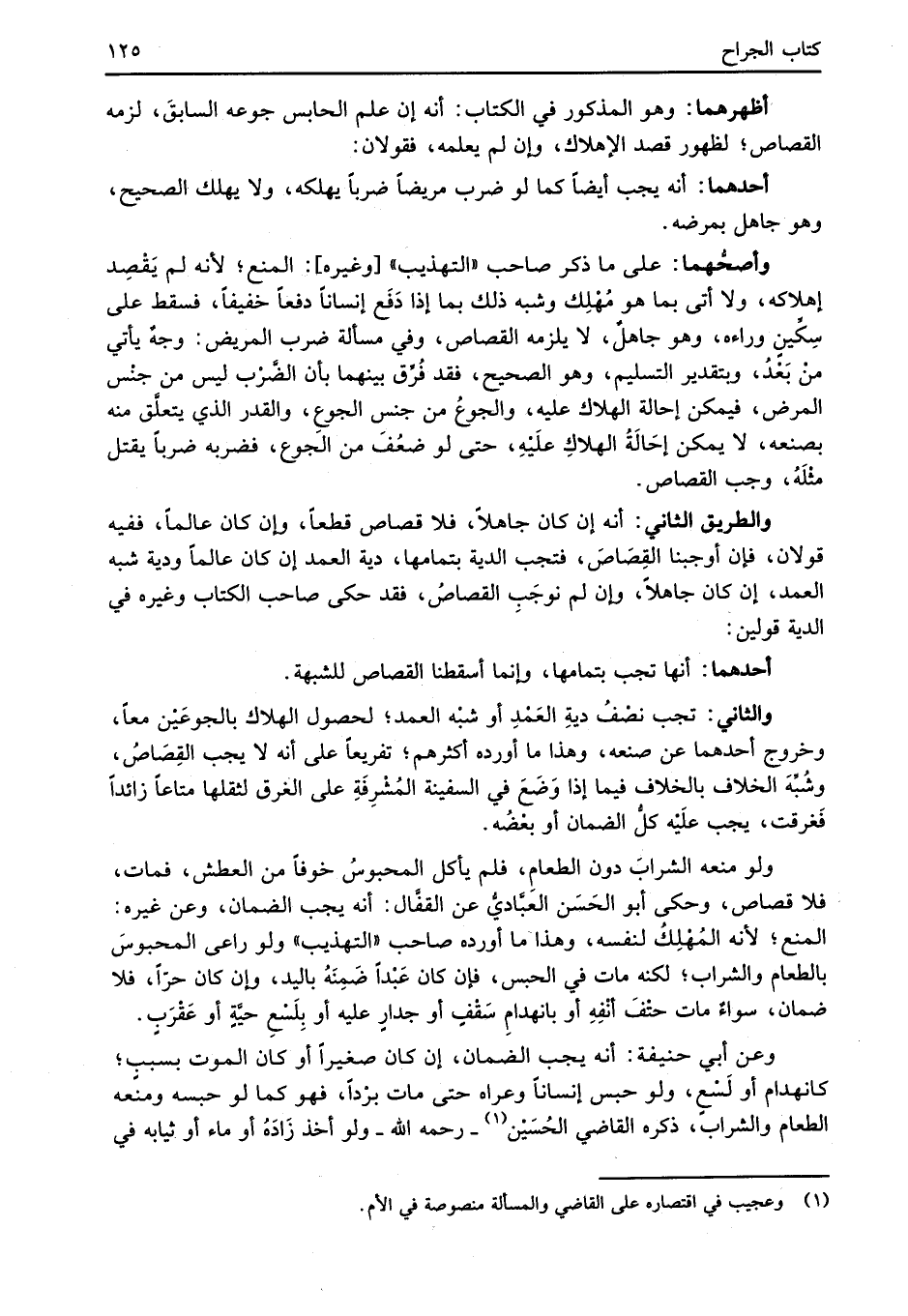 ولو منعه الشرابَ دون الطعام، فلم يأكل المحبوسُ خوفاً من العطش، فمات، فلا قصاص، وحكى أبو الحَسَنُ العَبَّاديُّ عن القفَّال: أنه يجب الضمان، وعن غيره: المنع؛ لأنه المُهْلِكُ لنفسه، وهذا ما أورده صاحب "التهذيب" ولو راعى المحبوسَ بالطعام والشراب؛ لكنه مات في الحبس، فإن كان عَبْداً ضَمِنَهُ باليد، وإن كان حرّاً، فلا ضمان، سواءٌ مات حتْفَ أنْفِهِ أو بانهدامِ سَقْفٍ أو جدارٍ عليه أو بِلَسْعِ حيَّةٍ أو عَقْرَبٍ.