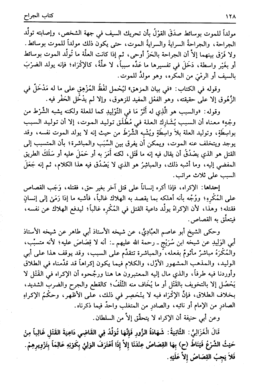 مولداً للموت بوسائط صدَقَ القوْلُ بأن تحريك السيف في جهة الشخص، وإصابته تولِّد الجراحة، والجراحةُ السرايةَ والسرايةُ الموت، حتى يكون ذلك مولداً للموت بوسائط. ولا فَرْق بينهما إلاَّ أن الجراحة بالحَزِّ أوحى، ثم إذا كانت العلَّة ما تُولِّد الموت بوسائط أو بغَيْر واسطة، دَخَلَ في تفسيرها ما عَدَّه سبباً، لا علَّةً، كالإكْرَاه؛ فإنه يولد الضرْبَ بالسيف أو الرمْيَ من المكره، وهو مولدُّ للموت.