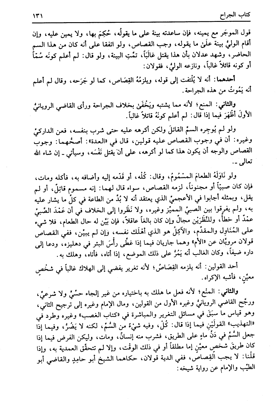 والثاني: المنْع؛ لأنه فعل ما هلك به باختياره من غير إلجاء حسَّيٍّ ولا شرعيٍّ، ورجَّح القاضي الرويانيُّ وغيره الأول من القولين، ومال الإِمام وغيره إلى ترجيح الثاني، وهو قياس ما سبَقَ في مسائل التغرير والمباشرة في "كتاب الغصب" وغيره وطرد في "التهذيب" القولَيْنِ فيما إذا قال: كُلْ، وفيه شيْءٌ من السُّمِّ، لكنه لا يَضُرُّ، وفيما إذا جعل السُّمَّ في دَنِّ ماءٍ على الطريق، فشرب منه إنسانٌ، ومات، وليكن الفرض فيما إذا كان طريقَ شخصٍ معيَّنِ إما مطلقاً أو في ذلك الوقْت، إلا لم تتحقَّق العمدية به، وإذا قلْنا: لا يجب القِصاص، ففي الدية قولان، حكاهما الشيخ أبو حامِدٍ والقاضي أبو الطيِّب والإمام عن رواية شيخه: