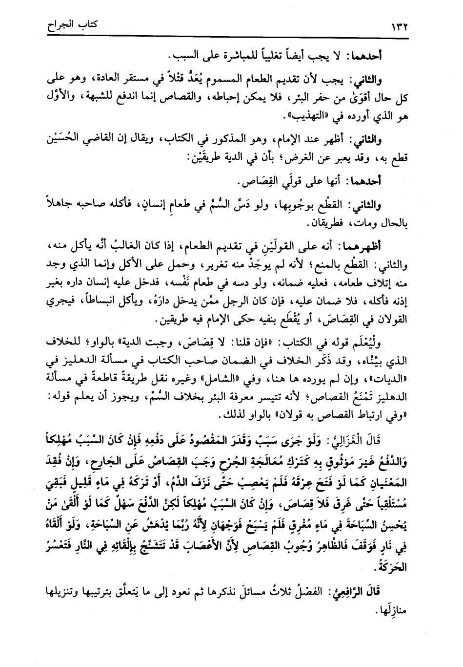 قَالَ الْغَزَالِيُّ: وَلَوْ جَرَى سَبَبٌ وَقَدَرَ المَقْصُودُ عَلَى دَفْعِهِ فَإِنْ كَانَ السَّبَبُ مُهْلِكاً وَالدَّفْعُ غَيْرَ مَوْثُوق بِهِ كَتَرْكِ مُعَالَجَةِ الجُرْحِ وَجَبَ القِصَاصُ عَلَى الجَارحِ، وَإِنْ فُقِدَ المَعْنَيانِ كَمَا لَوْ فَتَحَ عِرْقَهُ فَلَمْ يَعْصِبْ حَتَّى نَزَفَ الدَّمُ، أَوْ تَرَكهُ فِي مَاءٍ قَلِيلٍ فَبَقِيَ مُسْتَلْقِياً حَتَّى غَرِقَ فَلاَ قِصَاصَ، وَإِنْ كَانَ السَّبَبُ مُهْلِكاً لَكِنَّ الدَّفْعَ سَهْلٌ كَمَا لَوْ أَلْقَى مَنْ يُحْسِنُ السِّبَاحَةَ فِي مَاءٍ مُغْرِقٍ فَلَمْ يَسْبَحْ فَوَجْهَانِ لِأَنَّهُ رُبَّمَا يُدْهَشُ عَنِ السِّبَاحَةِ، وَلَوْ أَلْقَاهُ فِي نَارٍ فَوَقَفَ فَالظَّاهِرُ وُجُوبُ القِصَاصِ لِأَنَّ الأَعْصَابَ قَدْ تَتَشَنَّجُ بِإلقَائِهِ فِي النَّارِ فَتَعْسُرُ الحَرَكَةُ.