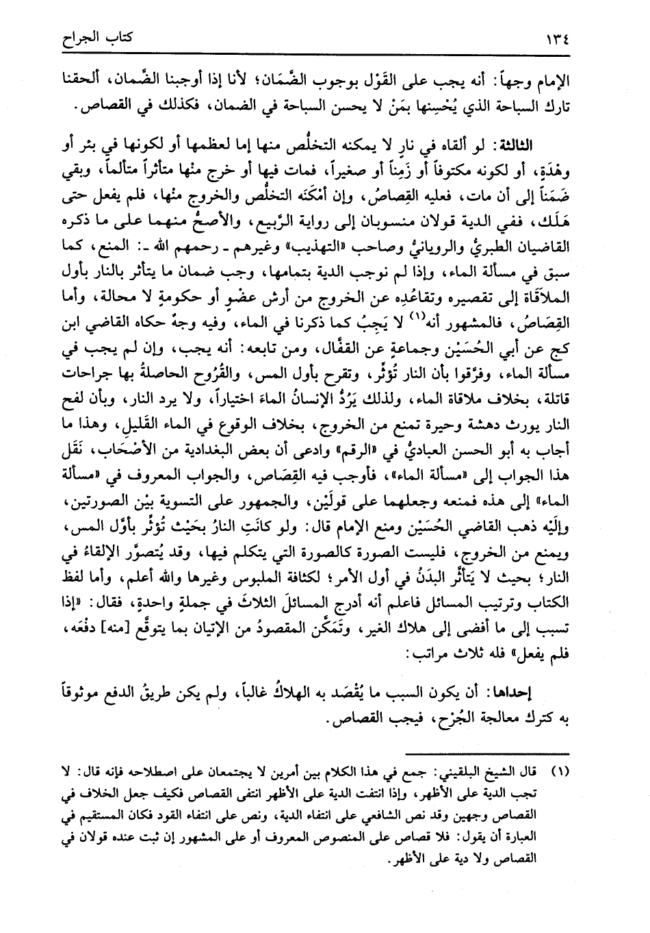 الثالثة: لو ألقاه في نارٍ لا يمكنه التخلُّص منها إما لعظمها أو لكونها في بئر أو وهْدَةٍ، أو لكونه مكتوفاً أو زَمِناً أو صغيراً، فمات فيها أو خرج منْها متأثراً متألماً، وبقي ضَمَناً إلى أن مات، فعليه القِصاصُ، وإن أمْكَنَه التخلُّص والخروج منْها، فلم يفعل حتى هَلَك، ففي الدية قولان منسوبان إلى رواية الرَّبيع، والأصحُّ منهما على ما ذكره القاضيان الطبريُّ والرويانيُّ وصاحب "التهذيب" وغيرهم -رحمهم الله-: المنع، كما سبق في مسألة الماء، وإذا لم نوجب الدية بتمامها، وجب ضمان ما يتأثر بالنار بأول الملاَقَاة إلى تقصيره وتقاعُدِه عن الخروج من أرش عضْوٍ أو حكومةٍ لا محالة، وأما القِصَاصُ، فالمشهور أنه (¬1) لا يَجِبُ كما ذكرنا في الماء، وفيه وجهٌ حكاه القاضي ابن كج عن أبي الحُسَيْن وجماعةٍ عن القفَّال، ومن تابعه: أنه يجب، وإن لم يجب في مسألة الماء، وفرَّقوا بأن النار تُؤثِّر، وتقرح بأول المس، والقُرُوح الحاصلةُ بها جراحات قاتلة، بخلاف ملاقاة الماء، ولذلك يَرُدُّ الإنسانُ الماءَ اختيارًا، ولا يرد النار، وبأن لفح النار يورث دهشة وحيرة تمنع من الخروج، بخلاف الوقوع في الماء القَليلِ، وهذا ما أجاب به أبو الحسن العباديُّ في "الرقم" وادعى أن بعض البغدادية من الأصْحَاب، نَقَل هذا الجواب إلى "مسألة الماء"، فأوجب فيه القِصَاص، والجواب المعروف في "مسألة الماء" إلى هذه فمنعه وجعلهما على قولَيْن، والجمهور على التسوية بيْن الصورتين، وإلَيْه ذهب القاضي الحُسَيْن ومنع الإِمام قال: ولو كانَتِ النارُ بحَيْث تُؤثِّر بأوَّل المس، ويمنع من الخروج، فليست الصورة كالصورة التي يتكلم فيها، وقد يُتصوَّر الإلقاءُ في النار؛ بحيث لا يَتأثَّر البدَنُ في أول الأمر؛ لكثافة الملبوس وغيرها والله أعلم، وأما لفظ الكتاب وترتيب المسائل فاعلم أنه أدرج المسائلَ الثلاثَ في جملةٍ واحدةٍ، فقال: "إذا تسبب إلى ما أفضى إلى هلاك الغير، وتَمَكَّن المقصودُ من الإتيان بما يتوقَّع [منه] دفْعَه، فلم يفعل" فله ثلاث مراتب: