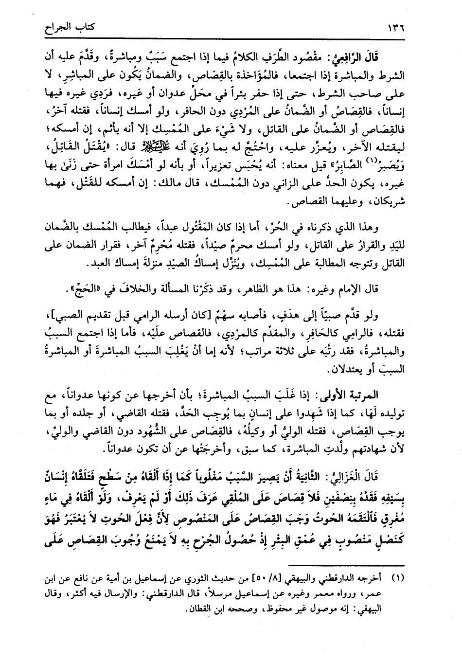 قَالَ الرَّافِعِيُّ: مقْصُود الطَّرَفِ الكلامُ فيما إذا اجتمع سَبَبٌ ومباشرةٌ، وقَدَّمَ عليه أن الشرط والمباشرة إذا اجتمعا، فالمُؤَاخذة بالقِصَاص، والضمانُ يَكُون على المباشِرِ، لا على صاحب الشرط، حتى إذا حفر بئراً في محَلِّ عدوان أو غيره، فرَدِي غيره فيها إنساناً، فالقِصَاصُ أو الضَّمانُ على المُرْدِي دون الحافر، ولو أمسك إنساناً، فقتله آخرُ، فالقِصَاص أو الضَّمانُ على القاتل، ولا شَيْءَ على المُمْسِك إلا أنه يأثم، إن أمسكه؛ ليقتله الآخر، ويُعزَّر عليه، واحْتُجَّ له بما رُوِيَ أنه -عليه السلام- قال: "يُقْتَلُ القَاتِلُ، وَيُصَبرُ (¬1) الصَّابِرُ" قيل معناه: أنه يُحْبَس تعزيراً، أو بأنه لو أمْسَكَ امرأة حتى زَنَى بها غيره، يكون الحدُّ على الزاني دون المُمْسك، قال مالك: إن أمسكه للقَتْل، فهما شريكان، وعليهما القصاص.