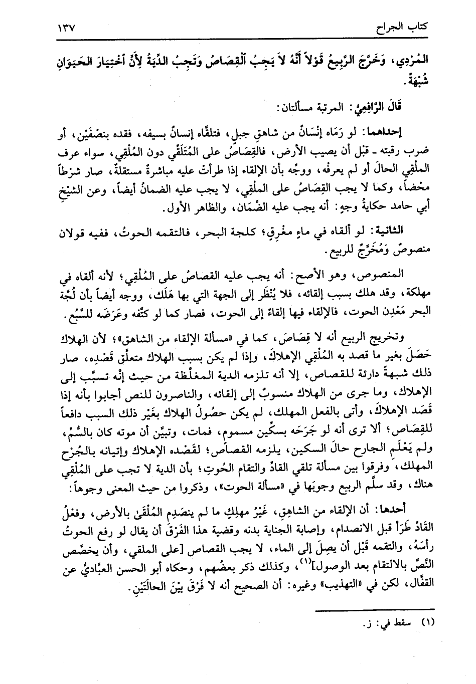 أحدها: أن الإلقاء من الشاهِقِ، غَيْرُ مهلِكٍ ما لم ينصَدِم المُلْقَى بالأرض، وفعْلُ القَادَّ طَرَأ قبل الانصدام، وإصابة الجناية بدنه وقضية هذا الفَرْقَ أن يقال لو رفع الحوتُ رأسَهُ، والتقمه قَبْل أن يصِلَ إلى الماء، لا يجب القصاص [على الملقي، وأن يخصَّص النَّصَّ بالالتقام بعد الوصول] (¬1)، وكذلك ذكر بعضُهم، وحكاه أبو الحسن العبَّاديُّ عن القفَّال، لكن في "التهذيب" وغيره: أن الصحيح أنه لا فرْقَ بيْنَ الحالَتَيْنِ.
