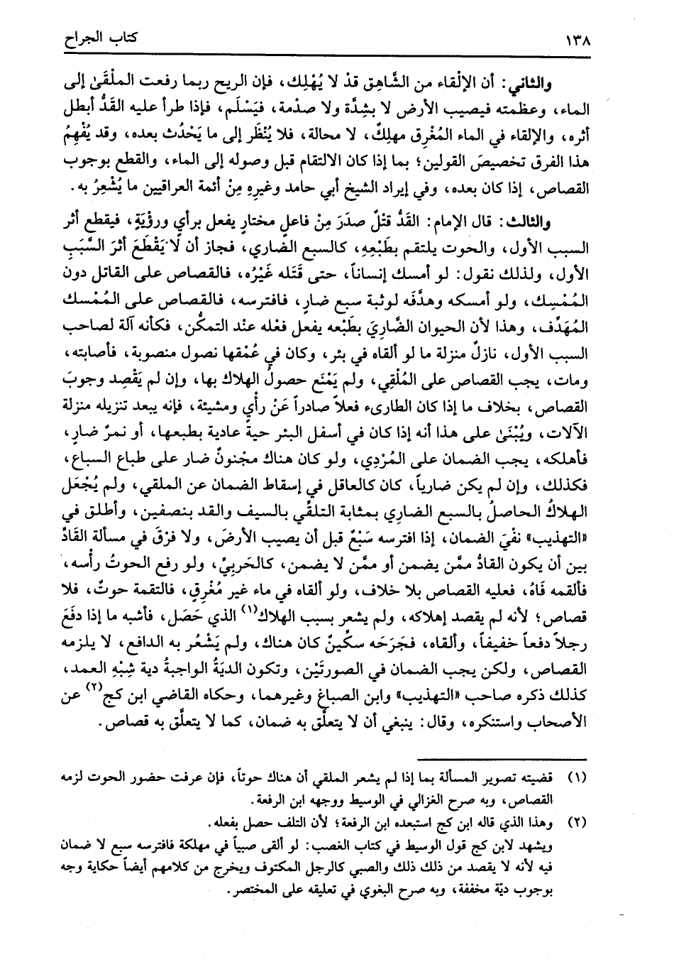 والثالث: قال الإِمام: القَدُّ قتل صدَرَ مِنْ فاعلٍ مختارٍ يفعل برأي ورؤْيَةٍ، فيقطع أثر السبب الأول، والحوت يلتقم بطَبْعِهِ، كالسبع الضاري، فجاز أن لا يَقْطَعَ أثرَ السَّبَبِ الأول، ولذلك نقول: لو أمسك إنساناً، حتى قَتَله غَيْرُه، فالقصاص على القاتل دون الممُسِك، ولو أمسكه وهدَّفَه لوثبة صبع ضارٍ، فافترسه، فالقصاص على المُمْسك المُهَدِّف، وهذا لأن الحيوان الضَّارِيَ بطَبعه يفعل فعْله عنْد التمكُّن، فكأنه آلة لصاحب السبب الأول، نازلٌ منزلة ما لو ألقاه في بئر، وكان في عُمْقها نصول منصوبة، فأصابته، ومات، يجب القصاص على المُلْقِي، ولم يمنَع حصولُ الهلاك بها، وإن لم يقْصِد وجوبَ القصاص، بخلاف ما إذا كان الطارئ فعلاً صادراً عَنْ رأْي ومشيئة، فإنه يبعد تنزيله منزلة الآلات، ويُبْنَى على هذا أنه إذا كان في أسفل البئر حية عادية بطبعها، أو نمرٌ ضارٍ، فأهلكه، يجب الضمان على المُرْدِي، ولو كان هناك مجْنونٌ ضار على طباع السباع، فكذلك، وإن لم يكن ضارياً، كان كالعاقل في إسقاط الضمان عن الملقي، ولم يُجْعَل الهلاكُ الحاصلُ بالسبع الضارِي بمثابة التلقِّي بالسيف والقد بنصفين، وأطلق في "التهذيب" نفْيَ الضمان، إذا افترسه سَبْعٌ قبل أن يصيب الأرضَ، ولا فرْقَ في مسألة القَادِّ بين أن يكون القادُّ ممَّن يضمن أو ممَّن لا يضمن، كالحَربيَّ، ولو رفع الحوتُ رأْسه، فألقمه فَاهُ، فعليه القصاص بلا خلاف، ولو ألقاه في ماء غير مُغْرِقٍ، فالتقمة حوتٌ، فلا قصاص؛ لأنه لم يقصد إهلاكه، ولم يشعر بسبب الهلاك (¬1) الذي حَصَل، فأشبه ما إذا دفَعَ رجلاً دفعاً خفيفاً، وألقاه، فجَرَحَه سكِّينٌ كان هناك، ولم يَشْعُر به الدافع، لا يلزمه القصاص، ولكن يجب الضمان في الصورتَيْن، وتكون الديَةُ الواجبة دية شِبْهِ العمد، كذلك ذكره صاحب "التهذيب" وابن الصباغ وغيرهما، وحكاه القاضي ابن كج (¬2) عن الأصحاب واستنكره، وقال: ينبغي أن لا يتعلَّق به ضمان، كما لا يتعلَّق به قصاص.