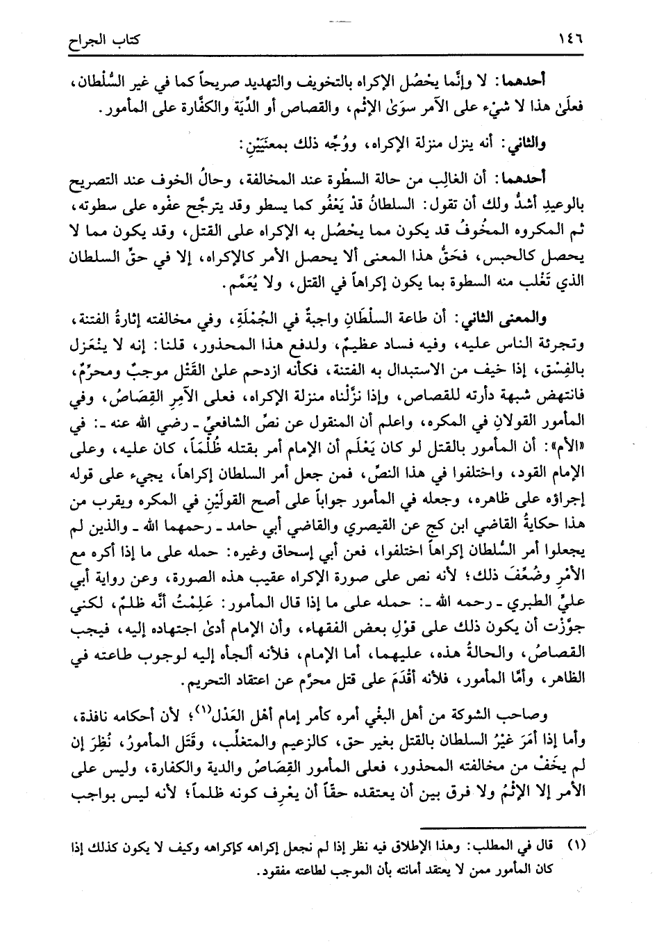 أحدهما: أنَّ الغالِب من حالة السطوة عند المخالفة، وحالُ الخوف عند التصريح بالوعيدِ أشدُّ ولك أنَّ تقول: السلطانُ قدْ يَعْفُو كما يسطو وقد يترجَّح عفْوه على سطوته، ثم المكروه المخُوفُ قد يكون مما يحْصُل به الإكراه على القتل، وقد يكون مما لا يحصل كالحبس، فحَقُّ هذا المعنى ألا يحصل الأمر كالإكراه، إلا في حقِّ السلطان الذي تَغْلب منه السطوة بما يكون إكراهاً في القتل، ولا يُعَمَّم.