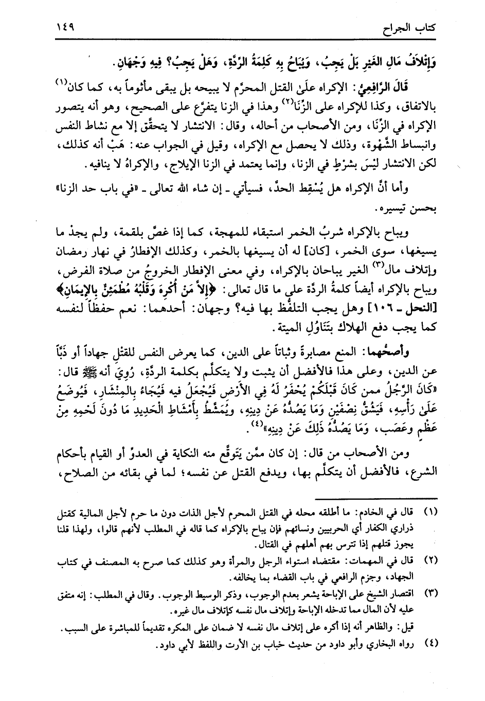 قَالَ الرَّافِعِيُّ: الإكراه عَلَى القتل المحرَّم لا يبيحه بل يبقى مأثوماً به، كما كان (¬1) بالاتفاق، وكذا للإكراه على الزِّنَا (¬2) وهذا في الزنا يتفرَّع على الصحيح، وهو أنه يتصور الإكراه في الزِّنَا، ومن الأصحاب من أحاله، وقال: الانتشار لا يتحقَّق إلا مع نشاط النفس وانبساط الشَّهْوة، وذلك لا يحصل مع الإكراه، وقيل في الجواب عنه: هَبْ أنه كذلك، لكن الانتشار ليْسَ بشرْطٍ في الزنا، وإنما يعتمد في الزنا الإيلاج، والإكراهُ لا ينافيه.