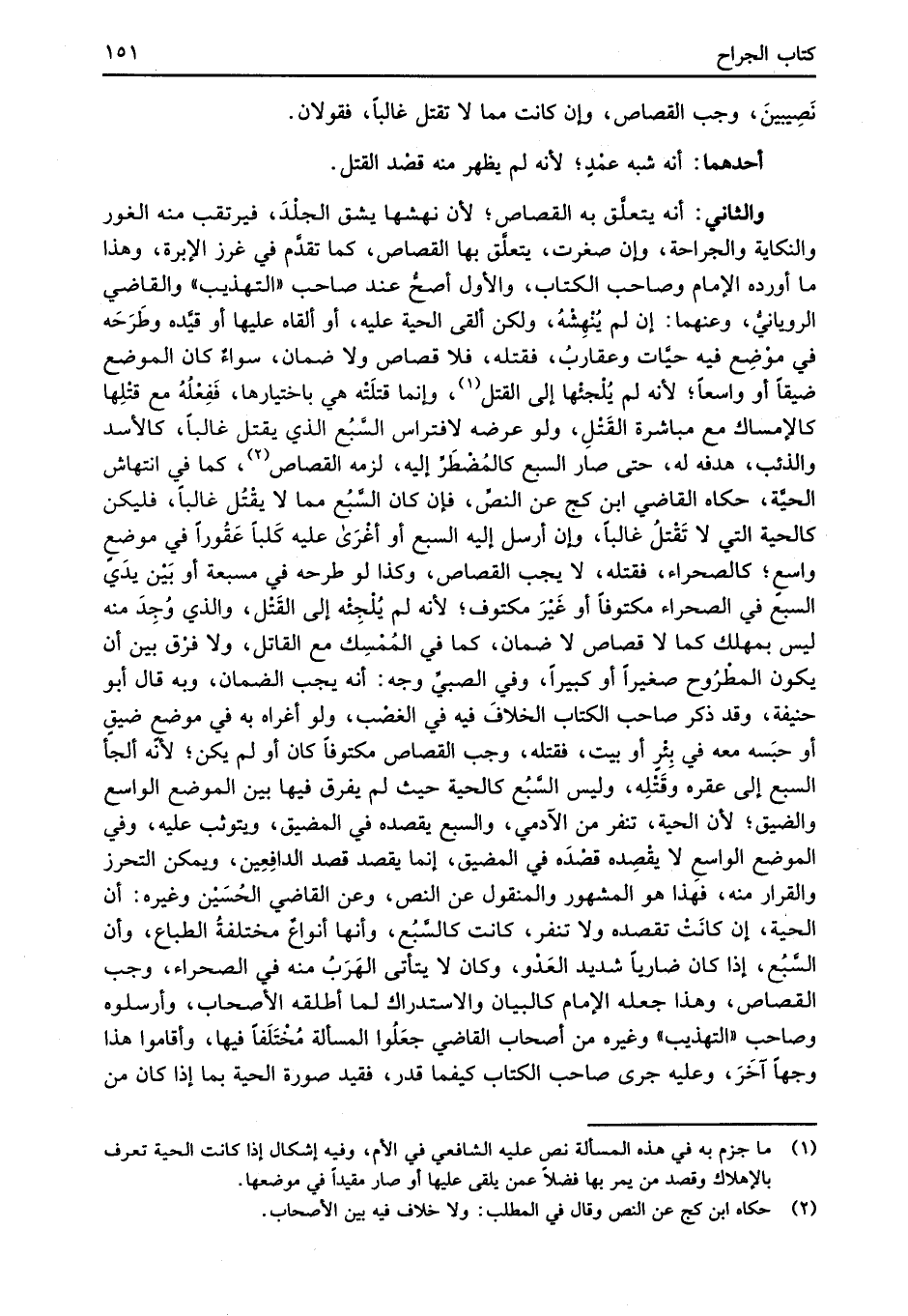 والثاني: أنه يتعلَّق به القصاص؛ لأن نهشها يشق الجلْدَ، فيرتقب منه الغور والنكاية والجراحة، وإن صغرت، يتعلَّق بها القصاص، كما تقدَّم في غرز الإبرة، وهذا ما أورده الإِمام وصاحب الكتاب، والأول أصحُّ عند صاحب "التهذيب" والقاضي الرويانيُّ، وعنهما: إن لم يُنْهِشْهُ، ولكن ألقى الحية عليه، أو ألقاه عليها أو قيَّده وطَرَحَه في موْضِع فيه حيَّات وعقاربُ، فقتله، فلا قصاص ولا ضمان، سواءٌ كان الموضع ضيقاً أو واسعاً؛ لأنه لم يُلْجئْها إلى القتل (¬1)، وإنما قتلَتْه هي باختيارها، فَفِعْلُهُ مع قتْلِها كالإمساك مع مباشرة القَتْلِ، ولو عرضه لافتراس السَّبُع الذي يقتل غالباً، كالأسد والذئب، هدفه له، حتى صار السبع كالمُضْطَر إليه، لزمه القصاص (¬2)، كما في انتهاش الحيَّة، حكاه القاضي ابن كج عن النصِّ، فإن كان السَّبُع مما لا يقْتُل غالباً، فليكن كالحية التي لا تَقْتلُ غالباً، وإن أرسل إليه السبع أو أغْرَى عليه كَلباً عَقُوراً في موضعٍ واسعٍ؛ كالصحراء، فقتله، لا يجب القصاص، وكذا لو طرحه في مسبعة أو بَيْن يدَي السبع في الصحراء مكتوفاً أو غَيْرَ مكتوف؛ لأنه لم يُلْجِئْه إلى القَتْل، والذي وُجِدَ منه ليس بمهلك كما لا قصاص لا ضمان، كما في المُمْسِك مع القاتل، ولا فرْق بين أن يكون المطرُوح صغيراً أو كبيراً، وفي الصبى وجه: أنه يجب الضمان، وبه قال أبو حنيفة، وقد ذكر صاحب الكتاب الخلافَ فيه في الغصْب، ولو أغراه به في موضعٍ ضيقٍ أو حبَسه معه في بِئْرٍ أو بيت، فقتله، وجب القصاص مكتوفاً كان أو لم يكن؛ لأنه ألجأ السبع إلى عقره وقَتْلِه، وليس السَّبُع كالحية حيث لم يفرق فيها بين الموضع الواسع والضيق؛ لأن الحية، تنفر من الآدمي، والسبع يقصده في المضيق، ويتوثب عليه، وفي الموضع الواسعِ لا يقْصِده قصْدَه في المضيق، إنما يقصد قصد الدافِعِين، ويمكن التحرز والقرار منه، فهذا هو المشهور والمنقول عن النص، وعن القاضي الحُسَيْن وغيره: أن الحية، إن كانَتْ تقصده ولا تنفر، كانت كالسَّبُع، وأنها أنواعٌ مختلفةُ الطباع، وأن السَّبُع، إذا كان ضارياً شديد العَدْو، وكان لا يتأتى الهَرَبُ منه في الصحراء، وجب القصاص، وهذا جعله الإِمام كالبيان والاستدراك لما أطلقه الأصحاب، وأرسلوه وصاحب "التهذيب" وغيره من أصحاب القاضي جعَلُوا المسألة مُخْتَلَفاً فيها، وأقاموا هذا وجهاً آخَرَ، وعليه جرى صاحب الكتاب كيفما قدر، فقيد صورة الحية بما إذا كان من
