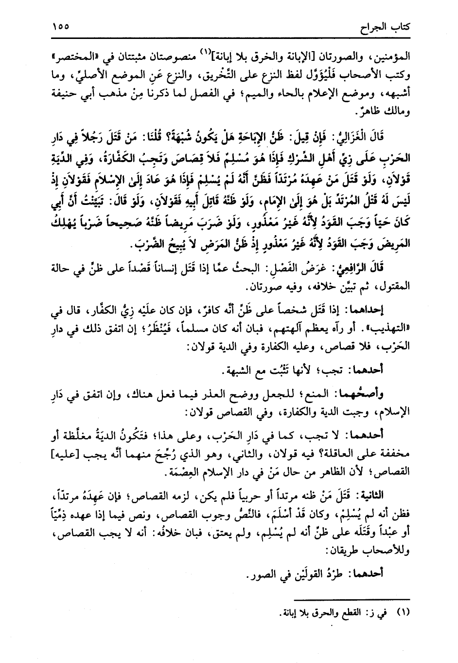 قَالَ الَغَزَالِيُّ: فَإِنْ قِيلَ: ظَنُّ الإِبَاحَةِ هَلْ يَكُونُ شُبْهَةً؟ قُلْنَا: مَنْ قَتَلَ رَجُلاً فِي دَارِ الحَرْبِ عَلَى زِيَّ أَهْلِ الشِّرْكِ فَإذَا هُوَ مُسْلِمُ فَلاَ قِصَاصَ وَتَجِبُ الكَفَّارَةُ، وَفِي الدِّيَةِ قَوْلاَنِ، وَلَوْ قَتَلَ مَنْ عَهِدَهُ مُرْتدّاً فَظَنَّ أنَّهُ لَمْ يُسْلِمْ فَإذَا هُوَ عَادَ إِلَى الإِسْلاَمِ فَقَولاَنِ إِذْ لَيْسَ لَهُ قَتْلُ المُرتَدِّ بَلْ هُوَ إلى الإِمَامِ، وَلَو ظَنَّهُ قَاِتلَ أَبِيهِ فَقَوْلاَنِ، وَلَوْ قَالَ: تَبَيَّنْتُ أَنَّ أَبِي كَانَ حَيّاً وَجَبَ القَوَدُ لِأَنَّهُ غَيْرُ مَعْذُورٍ، وَلَوْ ضَرَبَ مَرِيضاً ظَنَّهُ صَحِيحاً ضَرْباً يُهْلِكُ المَرِيضَ وَجَبَ القَوَدُ لِأَنَّهُ غَيْرُ مَعْذورِ إِذْ ظَنُّ المَرَضِ لاَ يُبِيحُ الضَّرْبَ.