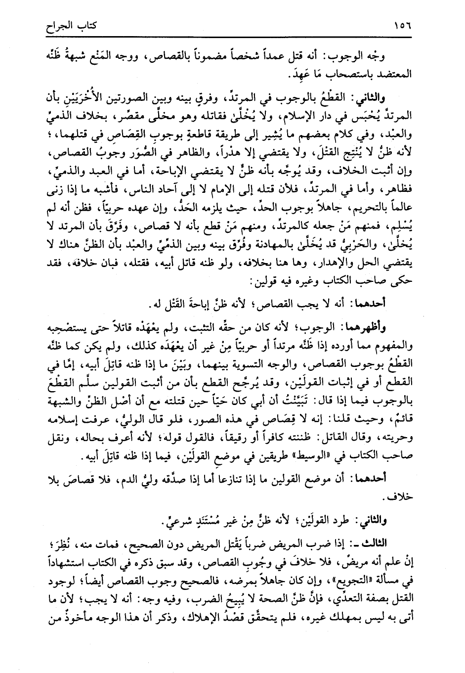والثاني: القطْعُ بالوجوب في المرتدِّ، وفرقٍ بينه وبين الصورتين الأخْرَيَيْنِ بأن المرتدَّ يُحْبَس في دار الإِسلام، ولا يُخْلَّى فقاتله وهو مخلَّى مقصِّر، بخلاف الذميِّ والعبْد، وفي كلام بعضهم ما يُشِير إلى طريقة قاطعةٍ بوجوب القِصَاصِ في قتلهما؛ لأنه ظنُّ لا يُنْتِج القتْلَ، ولا يقتضي إلا هدْرًا، والظاهر في الصُّوَر وجوبُ القصاص، وإن أثبت الخلاف، وقد يُوجُّه بأنه ظنٌّ لا يقتضي الإباحة، أما في العبد والذميِّ، فظاهر، وأما في المرتدِّ، فلأن قتله إلى الإِمام لا إلى آحاد الناس، فأشبه ما إذا زنى عالماً بالتحريم، جاهلاً بوجوب الحدِّ، حيث يلزمه الحَدُّ، وإن عهده حربيّاً، فظن أنه لم يُسْلِم، فمنهم مَنْ جعله كالمرتدِّ، ومنهم مَنْ قطع بأنه لا قصاص، وفَرَّقَ بأن المرتد لا يُخلَّى، والحَرْبِيُّ قد يُخَلَّى بالمهادنة وفُرِّق بينه وبين الذمِّيِّ والعبْد بأن الظن هناك لا يقتضي الحل والإهدار، وهاهنا بخلافه، ولو ظنه قاتل أبيه، فقتله، فبان خلافه، فقد حكى صاحب الكتاب وغيره فيه قولين: