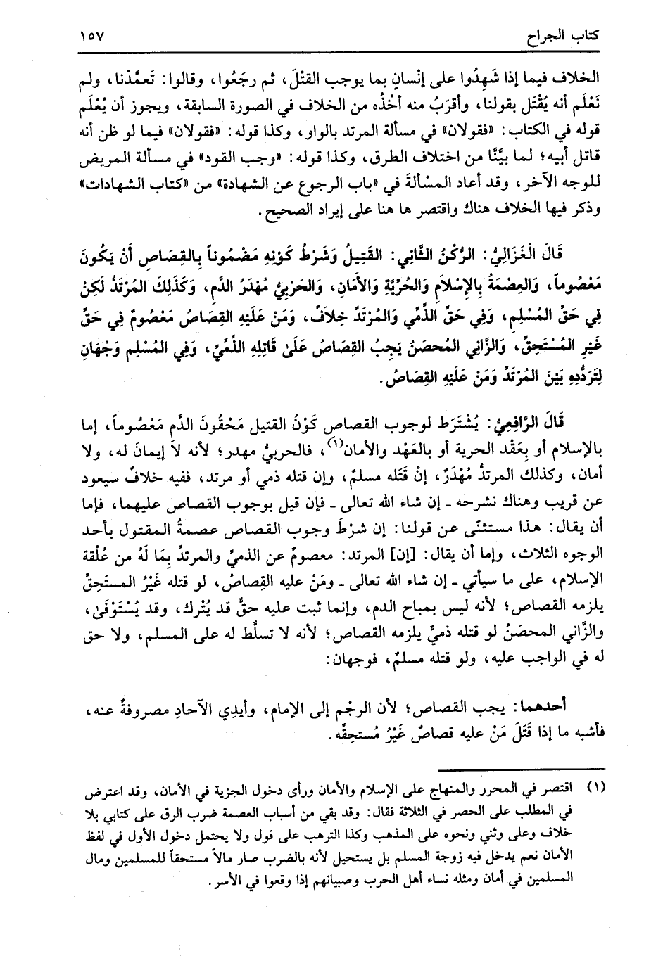 قَالَ الْغَزَالِيُّ: الرُّكْنُ الثَّانِي: القَتِيلُ وَشَرْطُ كَوْنِهِ مَضْمُوناً بِالقِصَاصِ أَنْ يَكُونَ مَعْصُوماً، وَالعِصْمَةُ بِالإِسْلاَمِ وَالحُرِّيَّةِ وَالأَمَانِ، وَالحَرْبِيُّ مُهْدَرُ الدَّمِ، وَكَذَلِكَ المُرْتَدُّ لَكِنْ فِي حَقِّ المُسْلِمِ، وَفِي حَقِّ الذِّمِّي وَالمُرْتَدِّ خِلاَفٌ، وَمَنْ عَلَيْهِ القِصَاصُ مَعْصُومُ فِي حَقِّ غَيْرِ المُسْتَحِقِّ، وَالزَّانِي المُحصَنُ يَجِبُ القِصَاصُ عَلَى قَاتِلِهِ الذِّمِّيِّ وَفِي المُسْلِم وَجْهَانِ لِتَرَدُّدِهِ بَيْنَ المُرْتَدِّ وَمَنْ عَلَيْهِ القِصَاصُ.