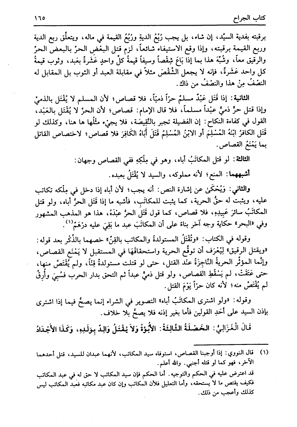 الثانية: إذا قَتَل عَبْدٌ مسلمٌ حرّاً ذميّاً، فلا قصاص؛ لأن المسلم لا يُقْتَل بالذميِّ هاذا قتل حرٌّ ذميٌّ عبْداً مسلماً، فلا قال الإِمام: قصاص؛ لأن الحرَّ لا يُقْتَل بالعَبْد، القول في كفاءة النكاح: إن الفضيلة تجبر بالنَّقِيصَة، فلا يجيْء مثْلُها هاهنا، وكذلك لو قَتَل الكافرُ ابْنَهُ المُسْلِمَ أو الابْنُ المُسْلِمُ قَتَلَ أَبَاهُ الكَافِرَ فلا قصاص؛ لاختصاص القاتل بما يَمْنَعُ القصاص.