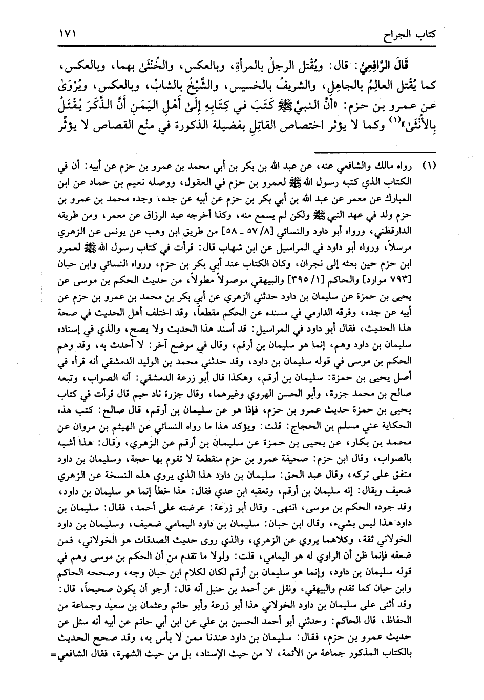 (¬1) رواه مالك والشافعي عنه، عن عبد الله بن بكر بن أبي محمد بن عمرو بن حزم عن أبيه: أن في الكتاب الذي كتبه رسول -صلى الله عليه وسلم- لعمرو بن حزم في العقول، ووصله نعيم بن حماد عن ابن المبارك عن معمر عن عبد الله بن أبي بكر بن حزم عن أبيه عن جده، وجده محمد بن عمرو بن حزم ولد في عهد النبي -صلى الله عليه وسلم- ولكن لم يسمع منه، وكذا أخرجه عبد الرزاق عن معمر، ومن طريقه الدارقطني، ورواه أبو داود والنسائي [8/ 57 - 58] من طريق ابن وهب عن يونس عن الزهري مرسلاً، ورواه أبو داود في المراسيل عن ابن شهاب قال: قرأت في كتاب رسول الله -صلى الله عليه وسلم- لعمرو ابن حزم حين بعثه إلى نجران، وكان الكتاب عند أبي بكر بن حزم، ورواه النسائي وابن حبان [793 موارد] والحاكم [1/ 395] والبيهقي موصولاً مطولاً، من حديث الحكم بن موسى عن يحيى بن حمزة عن سليمان بن داود حدثني الزهري عن أبي بكر بن محمد بن عمرو بن حزم عن أبيه عن جده، وفرقه الدارمي في مسنده عن الحكم مقطعاً، وقد اختلف أهل الحديث في صحة هذا الحديث، فقال أبو داود في المراسيل: قد أسند هذا الحديث ولا يصح، والذي في إسناده سليمان بن داود وهم، إنما هو سليمان بن أرقم، وقال في موضع آخر: لا أحدث به، وقد وهم الحكم بن موسى في قوله سليمان بن داود، وقد حدثني محمد بن الوليد الدمشقي أنه قرأه في أصل يحيى بن حمزة: سليمان بن أرقم، وهكذا قال أبو زرعة الدمشقي: أنه الصواب، وتبعه صالح بن محمد جزرة، وأبو الحسن الهروي وغيرهما، وقال جزرة ناد حيم قال قرأت في كتاب يحيى بن حمزة حديث عمرو بن حزم، فإذا هو عن سليمان بن أرقم، قال صالح: كتب هذه الحكاية عني مسلم بن الحجاج: قلت: ويؤكد هذا ما رواه النسائي عن الهيثم بن مروان عن محمد بن بكار، عن يحيى بن حمزة عن سليمان بن أرقم عن الزهري، وقال: هذا أشبه بالصواب، وقال ابن حزم: صحيفة عمرو بن حزم منقطعة لا تقوم بها حجة، وسليمان بن داود متفق على تركه، وقال عبد الحق: سليمان بن داود هذا الذي يروي هذه النسخة عن الزهري ضعيف ويقال: إنه سليمان بن أرقم، وتعقبه ابن عدي فقال: هذا خطأ إنما هو سليمان بن داود، وقد جوده الحكم بن موسى، انتهى. وقال أبو زرعة: عرضته على أحمد، فقال: سليمان بن داود هذا ليس بشيء، وقال ابن حبان: سليمان بن داود اليمامي ضعيف، وسليمان بن داود الخولاني ثقة، وكلاهما يروي عن الزهري، والذي روى حديث الصدقات هو الخولاني، فمن ضعفه فإنما ظن أن الراوي له هو اليمامي، قلت: ولولا ما تقدم من أن الحكم بن موسى وهم في قوله سليمان بن داود، وإنما هو سليمان بن أرقم لكان لكلام ابن حبان وجه، وصححه الحاكم وابن حبان كما تقدم والبيهقي، ونقل عن أحمد بن حنبل أنه قال: أرجو أن يكون صحيحاً، قال: وقد أثنى على سليمان بن داود الخولاني هذا أبو زرعة وأبو حاتم وعثمان بن سعيد وجماعة من الحفاظ، قال الحاكم: وحدثني أبو أحمد الحسين بن علي عن ابن أبي حاتم عن أبيه أنه سئل عن حديث عمرو بن حزم، فقال: سليمان بن داود عندنا ممن لا بأس به، وقد صحح الحديث بالكتاب المذكور جماعة من الأئمة، لا من حيث الإسناد، بل من حيث الشهرة، فقال الشافعي =
