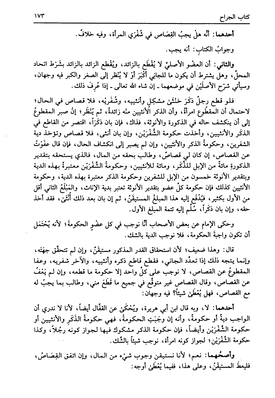 أحدهما: أنَّه هلْ يجبُ القِصَاص في شُفْرَي المرأة، وفيه خلافٌ.