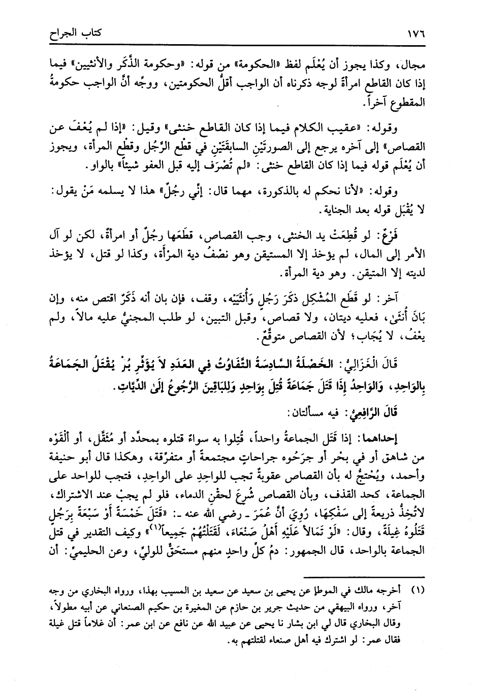 قَالَ الْغَزَالِيُّ: الخَصْلَة السَّادِسةُ التَّفَاوُتُ فِي العَدَدِ لاَ يُؤَثِّرِ بُلْ يُقْتَلُ الجَمَاعَةُ بِالوَاحِدِ، وَالوَاحِدُ إِذَا قَتَلَ جَمَاعَةً قُتِلَ بِوَاحِدٍ وَللبَاقِينَ الرُّجُوعُ إِلَى الدِّيَّاتِ.