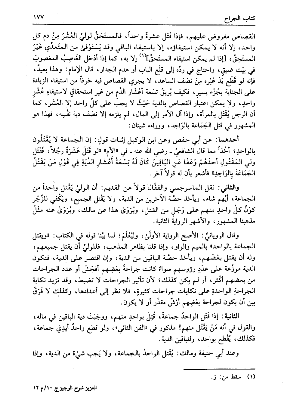 أحدهما: عن أبي حفص وعن ابن الوكيل إثبات قولٍ: إن الجماعة لا يُقْتَلُون بالواحدِ؛ أخْذاً مما قال الشَّافعيُّ -رضي الله عنه- في "الأم" "لو قَتَلَ عَشَرَةٌ رجُلاً، فَقَتَل ولي المَقْتُولِ أحدَهُمْ وَعَفَا عَنِ البَاقِينَ كَانَ لَهُ تِسْعَةُ أَعْشَارِ الدِّيَةِ فِي قَوْلِ مَنْ يَقْتُلُ الجَمَاعَةَ بِالوَاحِدِ" فأشعر بأن له قولاً آخر.