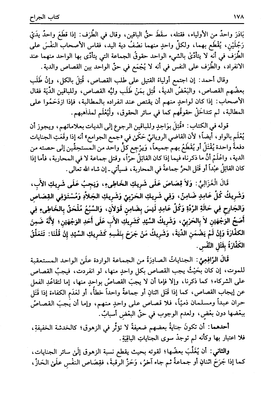 قَالَ الرَّافِعِيُّ: الجناياتُ الصادِرَةُ من الجماعة الواردة عَلَى الواحد المستعقبة للموت، إن كان بحَيْثُ يجب القصاص بكل واحدٍ منها، لو انفردت، فيجبُ القصاص على الشركاء؛ كما ذكرنا، وإلا فإما أن لا يجبَ القصاصُ بواحدٍ منها، إما لتقاعُدِ الفعل عن إيجاب القصاص، كما إذا قَتَل اثنانِ أو جماعةٌ واحداً خطأً، أو لعَدَمِ الكفاءة إذا قَتَل حران عبداً ومسلمان ذميّاً، فلا قصاص على واحدٍ منهم، وإما أن يجبَ القصاصُ ببعْضها دون بعْضٍ، ولعدم الوجوب في حقِّ البعْضِ أسبابٌ.