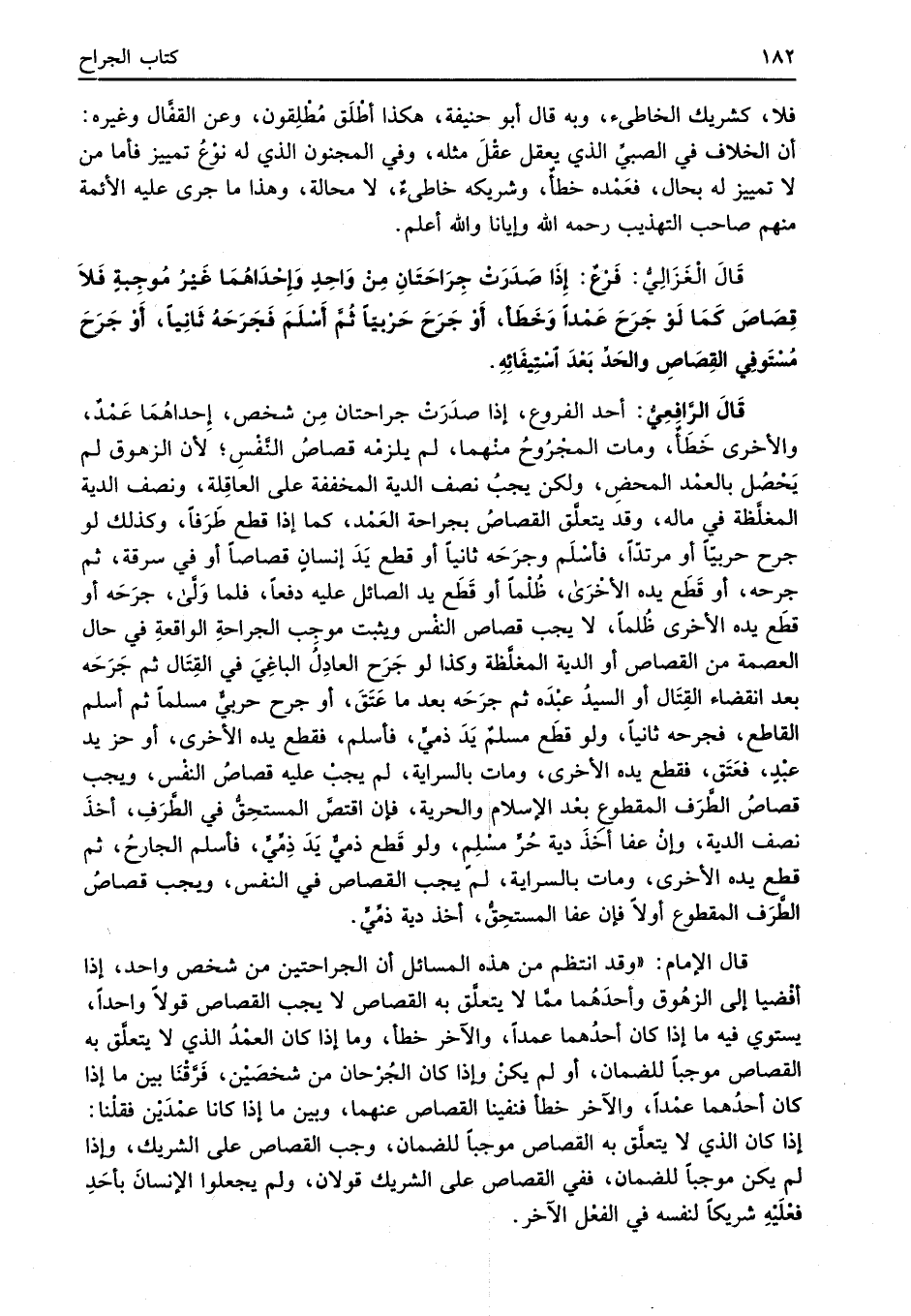 قال الإِمام: "وقد انتظم من هذه المسائل أن الجراحتين من شخص واحد، إذا أفْضيا إلى الزهُوق وأحدَهُما ممَّا لا يتعلَّق به القصاص لا يجب القصاص قولاً واحداً، يستوي فيه ما إذا كان أحدُهما عمداً، والآخر خطأ، وما إذا كان العمْدُ الذي لا يتعلَّق به القصاص موجباً للضمان، أو لم يكنْ وإذا كان الجُرْحان من شخصَيْن، فَرَّقْنَا بين ما إذا كان أحدُهما عمْداً، والآخر خطأ فنفينا القصاص عنهما، وبين ما إذا كانا عمْدَيْن فقلْنا: إذا كان الذي لا يتعلَّق به القصاص موجباً للضمان، وجب القصاص على الشريك، وإذا لم يكن موجباً للضمان، ففي القصاص على الشريك قولان، ولم يجعلوا الإنسانَ بأحَدِ فعْلَيْهِ شريكاً لنفسه في الفعْل الآخر.