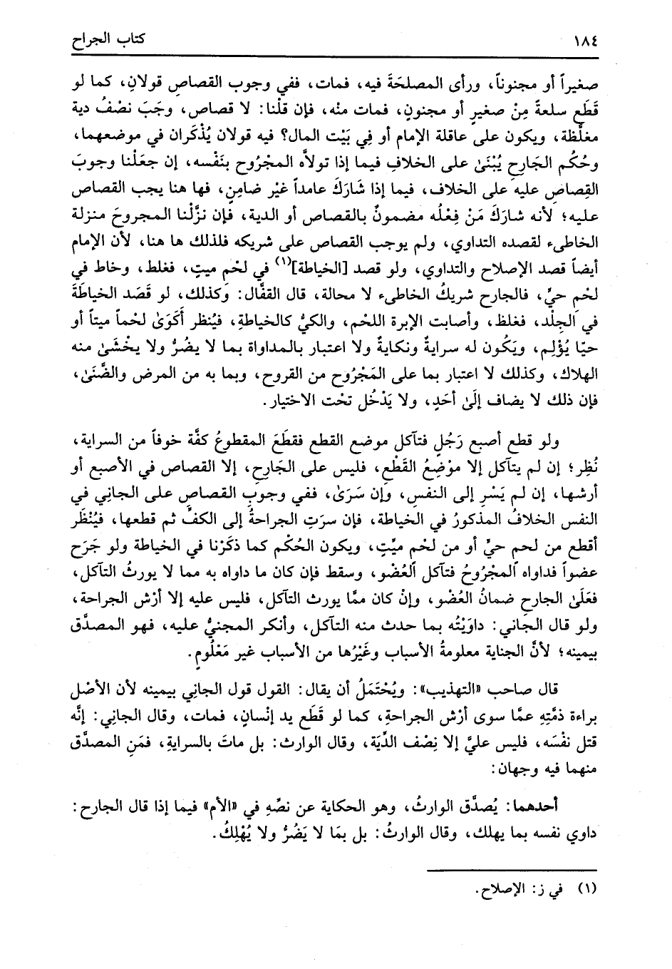 صغيراً أو مجنوناً، ورأى المصلحَةَ فيه، فمات، ففي وجوب القصاصِ قولانِ، كما لو قَطَع سلعةً مِنْ صغيرٍ أو مجنونٍ، فمات منْه، فإن قلْنا: لا قصاص، وجَبَ نصْفُ دية مغلَّظة، ويكون على عاقلة الإِمام أو فِي بَيْت المال؟ فيه قولان يُذْكَران في موضعهما، وحُكُم الجَارِحِ يُبْنَى على الخلافِ فيما إذا تولاَّه المجْرُوح بنَفْسه، إن جعَلْنا وجوبَ القِصاصِ عليه على الخلاف، فيما إذا شَارَكَ عامداً غيْر ضامِنٍ، فهاهنا يجب القصاص عليه؛ لأنه شارَكَ مَنْ فِعْلُه مضمونٌ بالقصاص أو الدية، فإن نزَّلْنا المجروحَ منزلة الخاطئ لقصده التداوي، ولم يوجب القصاص على شريكه فلذلك هاهنا؛ لأن الإِمام أيضاً قصد الإصلاح والتداوي، ولو قصد [الخياطة] (¬1) في لحْم ميتٍ، فغلط، وخاط في لحْمِ حيٍّ، فالجارح شريكُ الخاطئ لا محالة، قال القفَّال: وَكذلك، لو قَصَد الخياطَةَ في الجِلْد، فغلظ، وأصابت الإبرة اللحْم، والكيُّ كالخياطةِ، فيُنظر أَكَوَى لحْماً ميتاً أو حيًّا يُؤْلِم، ويَكُون له سرايةٌ ونكايةٌ ولا اعتبار بالمداواة بما لا يضُرُّ ولا يخْشَى منه الهلاك، وكذلك لا اعتبار بما على المَجْرُوح من القروح، وبما به من المرض والضَّنَى، فإن ذلك لا يضاف إلَى أحَدٍ، ولا يَدْخُل تحْت الاختيار.