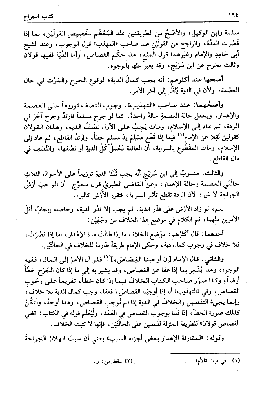 والثالث: منسوبٌ إلى ابن سُرَيْجٍ أنَّه يجب ثُلُثَا الديةِ توزيعاً على الأحوال الثلاثِ حالَتَي العصمة وحالة الإهدار، وعن القاضي الطبريّ قول محوَّج: أن الواجبَ أرْشُ الجراحة لا غير؛ لأن الردة تقطع تأثير السراية، فتقرر الأَرْش كالبرء.