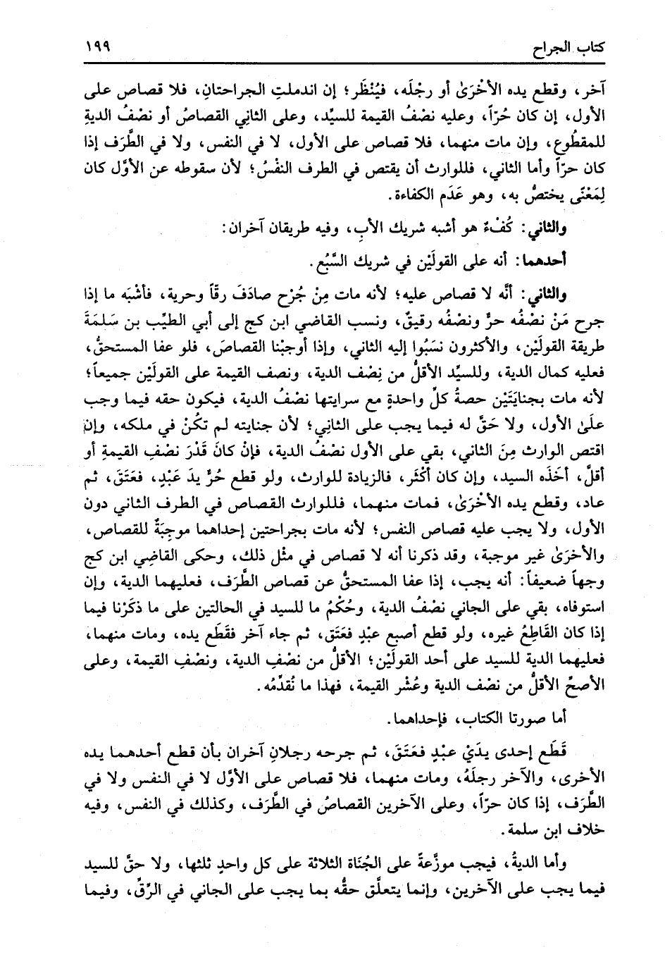 والثاني: أنَّه لا قصاص عليه؛ لأنه مات مِنْ جُرْح صادَفَ رقاً وحرية، فأشْبَه ما إذا جرح مَنْ نصْفُه حرٌّ ونصْفُه رقيقٌ، ونسب القاضي ابن كج إلى أبي الطيِّب بن سَلمَةَ طريقة القولَيْن، والأكثرون نسَبُوا إليه الثاني، لماذا أوجبْنا القصاصَ، فلو عفا المستحقُّ، فعليه كمال الدية، وللسيِّد الأقلُّ من نِصْف الدية، ونصف القيمة على القولَيْن جميعًا؛ لأنه مات بجنايَتَيْن حصةُ كلِّ واحدةٍ مع سرايتها نصْفُ الدية، فيكون حقه فيما وجب عَلَى الأول، ولا حَقَّ له فيما يجب على الثانِي؛ لأن جنايته لم تكُنْ في ملكه، وإن اقتص الوارث مِنَ الثاني، بقي على الأول نصْفُ الدية، فإنْ كانَ قَدْرَ نصْفِ القيمةِ أو أقلَّ، أخَذَه السيد، وإن كان أكْثَر، فالزيادة للوارث، ولو قطع حُرٌّ يدَ عَبْدٍ، فعَتَقَ، ثم عاد، وقطع يده الأخْرَى، فمات منهما، فللوارث القصاص في الطرف الثاني دون الأول، ولا يجب عليه قصاص النفس؛ لأنه مات بجراحتين إحداهما موجِبَةٌ للقصاص، والأخرَى غير موجبة، وقد ذكرنا أنه لا قصاص في مثْل ذلك، وحكى القاضِي ابن كج وجهاً ضعيفاً: أنه يجب، إذا عفا المستحقُّ عن قصاص الطَّرَف، فعليهما الدية، وإن استوفاه، بقي على الجاني نصْفُ الدية، وحُكْمُ ما للسيد في الحالتين على ما ذكَرْنا فيما إذا كان القَاطِعُ غيره، ولو قطع أصبع عبْدٍ فعَتَق، ثم جاء آخر فقَطَع يده، ومات منهما، فعليهما الدية للسيد على أحد القولَيْن؛ الأقل من نصْفِ الدية، ونصْفِ القيمة، وعلى الأصحِّ الأقلُّ من نصْف الدية وعُشْر القيمة، فهذا ما نُقدِّمُه.