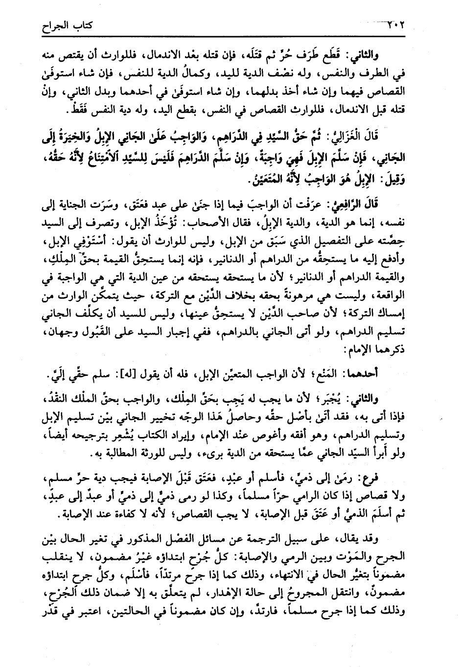 قَالَ الْغَزَالِيُّ: ثُمَّ حَقُّ السَّيِّدِ فِي الدَّرَاهِم، وَالوَاجِبُ عَلَى الجَانِي الإِبِلُ وَالخيَرَةُ إِلَى الجَانِي، فَإنْ سَلَّمَ الإِبِلَ فَهِيَ وَاجِبَةٌ، وَإنْ سَلَّمَ الدَّرَاهِمَ فَلَيْسَ لِلسَّيِّدِ الامْتِنَاعُ لأنَّهُ حَقُّهُ، وَقِيلَ: الإِبِلُ هُوَ الوَاجِبُ لأَنَّهُ المُتَعَيِّنُ.