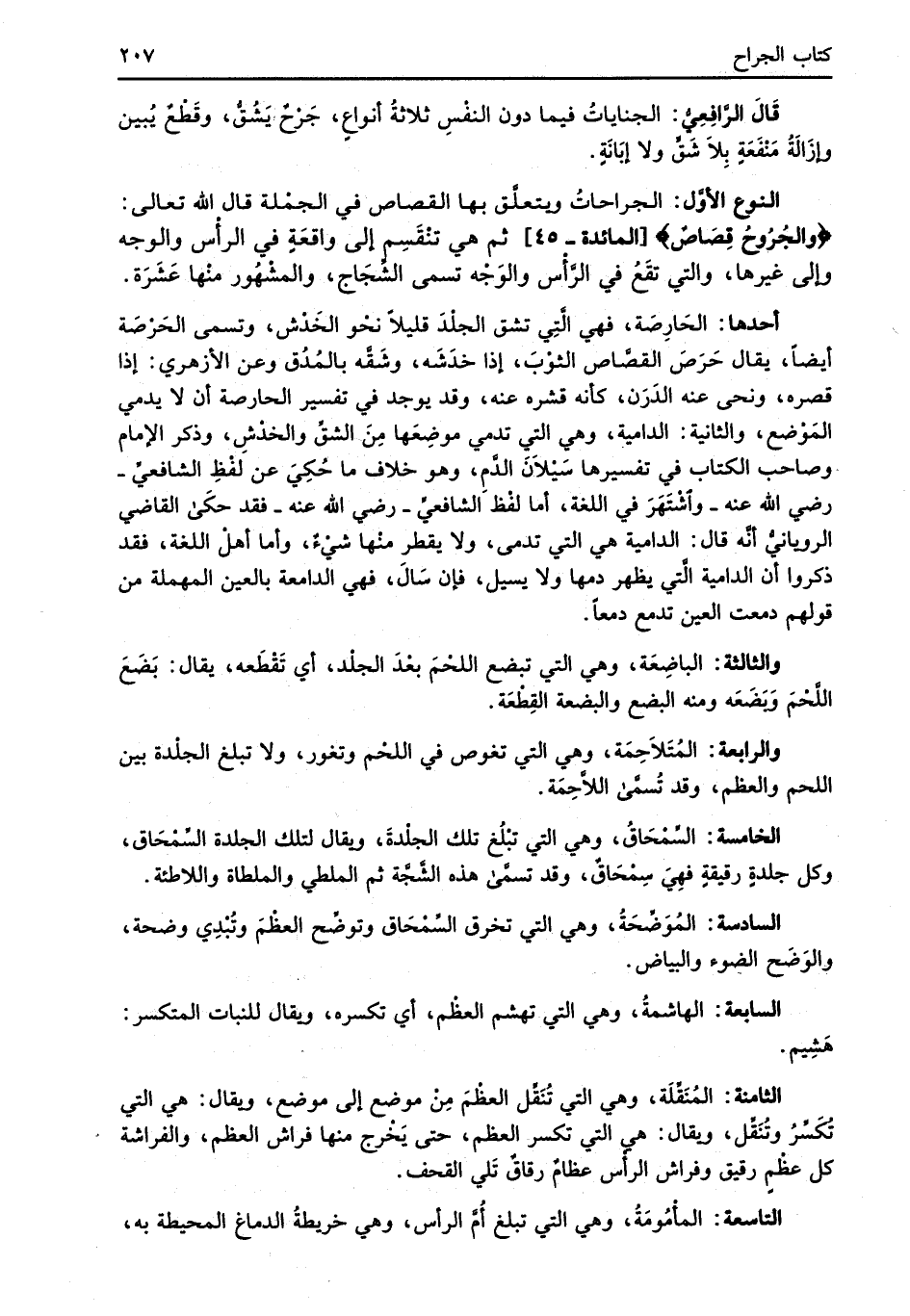 النوع الأوَّل: الجراحاتُ ويتعلَّق بها القصاص في الجمْلة قال الله تعالى: {وَالْجُرُوحَ قِصَاصٌ} [المائدة: 45] ثم هي تنْقَسِم إلى واقعَةٍ في الرأْس والوجه وإلى غيرها، والتي تقَعُ في الرَّأْس والوَجْه تسمى الشِّجَاج، والمشْهُور منْها عَشَرَة.