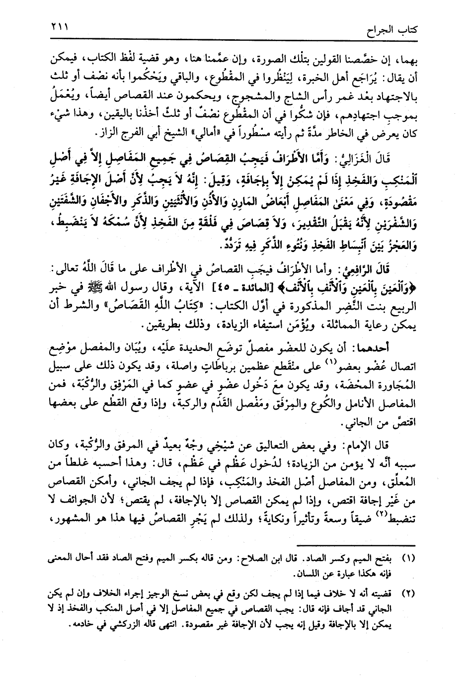قَالَ الْغَزَالِيُّ: وَأَمَّا الأَطْرَافُ فَيَجِبُ القِصَاصُ فِي جَمِيعِ المَفَاصِلِّ إِلاَّ في أَصْلِ الْمَنْكِبِ وَالفَخِذِ إِذَا لَمْ يُمَكِنْ اِلاَّ بإجَافَةٍ، وَقِيلَ: إنَّهُ لاَ يَجِبُ لِأَنَّ أَصْلَ الإِجَافَةِ غَيْرُ مَقْصُودَةٍ، وَفِي مَعْنَى المَفَاصِلِ أَبْعَاضُ المَارِنِ وَالأُذُنِ وَالأُنَثَيَيْنِ وَالذَّكَرِ والأَجْفَانِ وَالشَّفَتَيْنِ وَالشَّفْرَيْنِ لِأَنَّهُ يَقْبَلُ التَّقْدِيرَ، وَلاَ قِصَاصَ فِي فَلْقَةِ مِنَ الفَخِذِ لِأَنَّ سُمْكَهُ لاَ يَنْضَبِط، وَالعَجْزُ بَيْنَ انْبِسَاطِ الفَخِذِ وَنُتُوءِ الذَّكَرِ فِيهِ تَرَدُّدٌ.