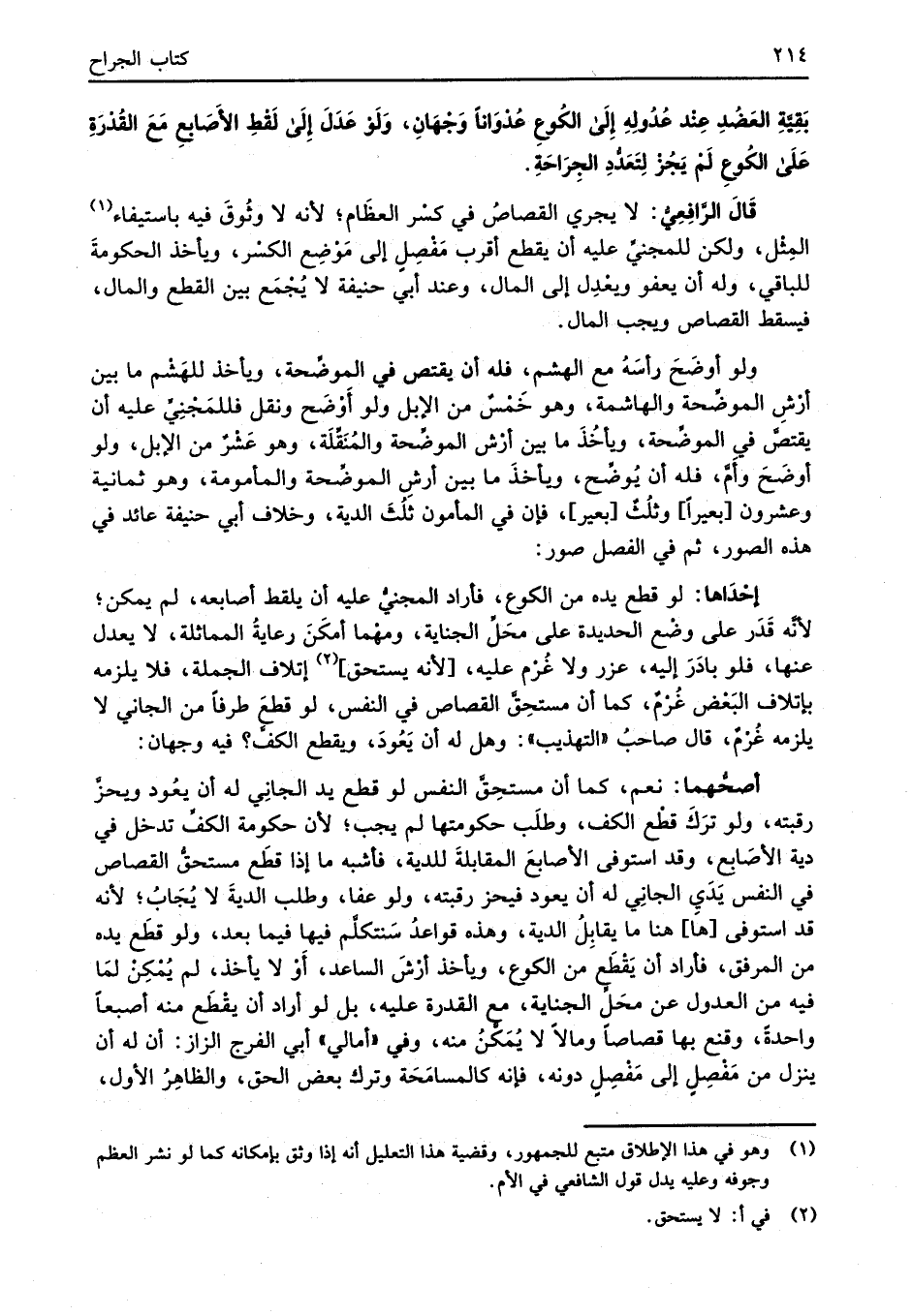 قَالَ الرَّافِعِيُّ: لا يجري القصاصُ في كسْر العظَام؛ لأنه لا وثُوقَ فيه باستيفاء (¬1) المِثْل، ولكن للمجنيِّ عليه أن يقطع أقرب مَفْصِل إلى مَوْضِع الكسْر، ويأخذ الحكومةَ للباقي، وله أن يعفو ويعْدِل إلى المال، وعند أبي حنيفة لا يُجْمَع بين القطع والمال، فيسقط القصاص ويجب المال.