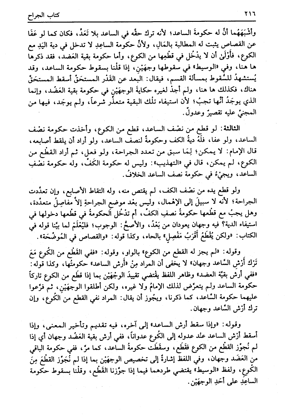 وقوله: "لم يجز له القطع من الكوع" بالواو، وقوله: " ففي القَطْع من الكُوع مَعَ ترْك أَرشِ السَّاعد وجهان" لا يخفى أن المراد مِنْ "أَرش الساعد" حكومتُها، وكذا قوله: "ففي أرش بقيَّة العضد" وظاهر اللفظ يقْتضي تقييدَ الوجْهَيْن بما إذا قطَع من الكوع تاركاً حكومة الساعد ولم يتعرَّض لذلك الإمامُ ولا غيره، ولكن أطلقوا الوجهَيْنِ، ثم فرَّعوا عليهما حكومة السَّاعد، كما ذكرنا، ويجُوز أن يقال: المراد نفي القطع من الكُوع، وإن ترك أرْش السَّاعد وجهان.