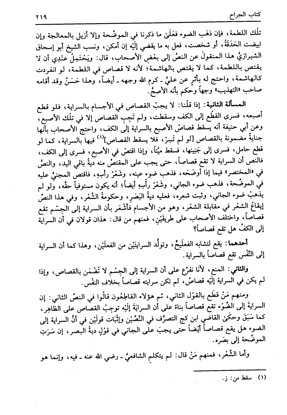 المسألة الثانية: إذا قلنا: لا يجبُ القصاص في الأجسام بالسراية، فلو قطع أصبعه، فسرى القطْع إلى الكف وسقطت، ولم تَجِبِ القصاص إلا في تلْك الأصبع، وعن أبي حنيفة أنه يسقط قصاصُ الأصبع بالسراية إلى الكف، واحتج الأصحاب بأنها جنايةٌ مضمونة بالقصاص [لو لم تَسِرْ، فلا يسقط القصاص] (¬1) فيها بالسراية، كما لو قطع حامل، فسرى إلى جَنِينها، فسقط ميِّتاً، وإذا اقتصّ في الأصبع، فسرى إلى الكف، فالنص أن السراية لا تقع قصاصاً، حتى يجب على المقتصِّ منه ديةُ باقي اليد، والنصُّ في "المختصر" فيما إذا أوضَحَه، فذهب ضوء عينه، وشَعْرُ رأسِهِ، فاقتص المجنيُّ عليه في الموضِّحة، فذهب ضوء الجاني، وشَعْرُ رأْسهِ أيضاً؛ أنه يكون مستوفياً حقَّه، ولو لم يذهبْ ضوء الجاني، وثبت شعره، فعليه ديةُ البَصَرِ، وحكومةُ الشَّعْر، وفي هذا النصِّ إيقاعُ الشعْر في مقابلة الشعْر، وهو من الأجسام فأشْعَر بأن السراية إلى الجِسْم تقع قصاصاً، واختلف الأصحاب على طريقَيْنِ، فمنهم من قال: هذان قولان في أن السراية إلى الكفِّ هل تقع قصاصاً؟
