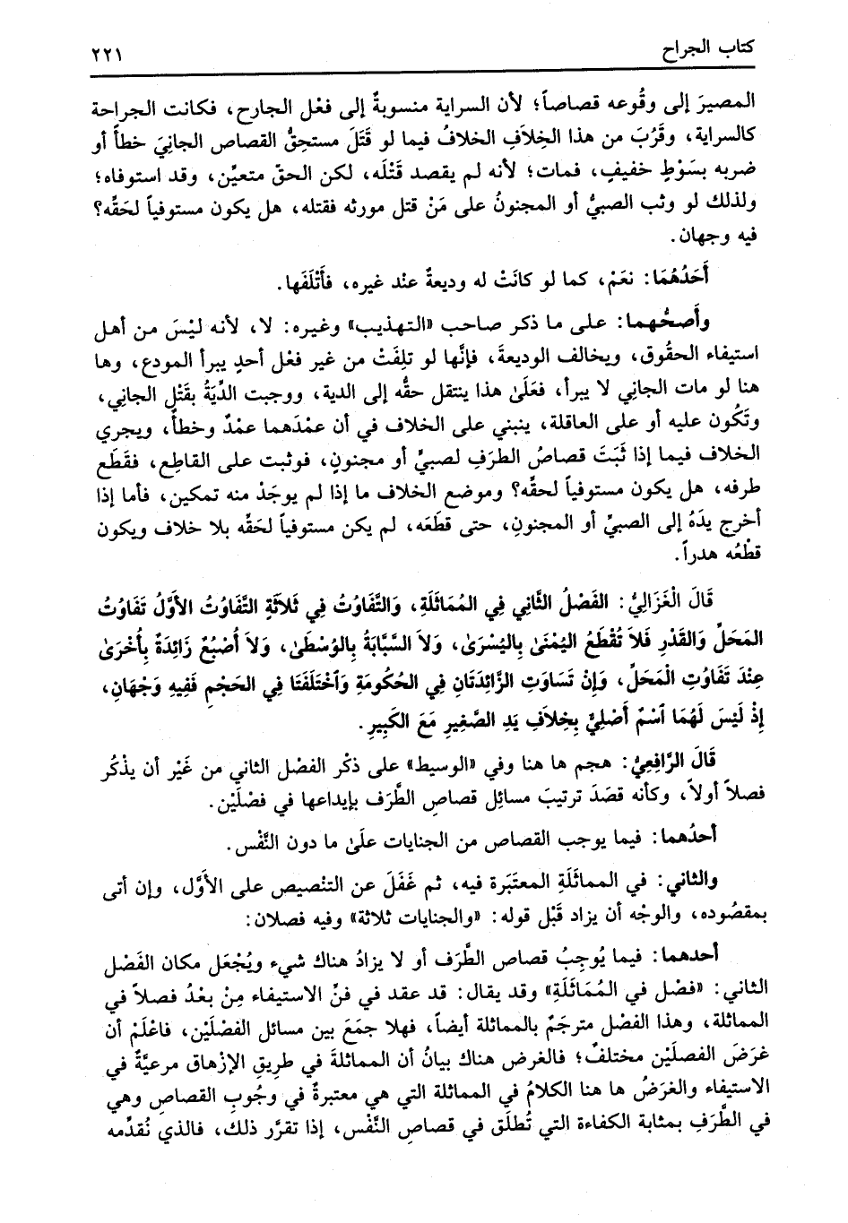 قَالَ الْغَزَالِيُّ: الفَصْلُ الثَّانِي في المُمَاثَلَةِ، وَالتَّفَاوُتُ فِي ثَلاثَةٍ التَّفَاوُتُ الأوَّلُ تَفَاوُتُ المَحَلِّ وَالقدْرِ فَلاَ تُقْطَعُ اليُمْنَى بِاليُسْرَى، وَلاَ السَّبَّابَةُ بِالوُسْطَى، وَلاَ أُصْبُعٌ زَائِدَةٌ بِأخْرَى عِنْدَ تَفَاوُتِ الْمَحَلِّ، وإنْ تَسَاوَتِ الزَّائِدَتَانِ فِي الحُكُومَةِ وَاخْتَلَفَتَا فِي الحَجْمِ فَفِيهِ وَجْهَانِ، إِذْ لَيْسَ لَهُمَا اسْمٌ أَصْلِيٌّ بِخِلافِ يَدِ الصَّغِيرِ مَعَ الكَبِيرِ.