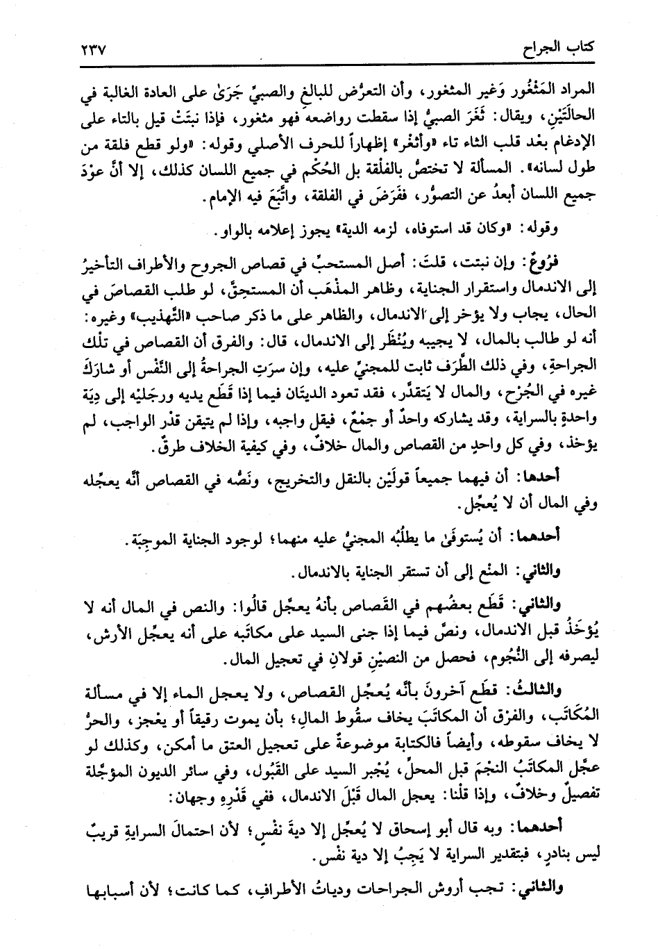 والثالثُ: قطَع آخرونَ بأنَّه يُعجِّل القصاص، ولا يعجل الماء إلا في مسألة المُكَاتَب، والفرْق أن المكاتَبَ يخاف سقُوط المالِ؛ بأن يموت رقيقاً أو يعْجز، والحرُّ لا يخاف سقوطه، وأيضاً فالكتابة موضوعةٌ على تعجيل العتق ما أمكن، وكذلك لو عجَّل المكاتَبُ النجْمَ قبل المحلِّ، يُجْبر السيد على القَبُول، وفي سائر الديون المؤجَّلة تفصيلٌ وخلافٌ، وإذا قلْنا: يعجل المال قَبْلَ الاندمال، ففي قَدْرِهِ وجهان: