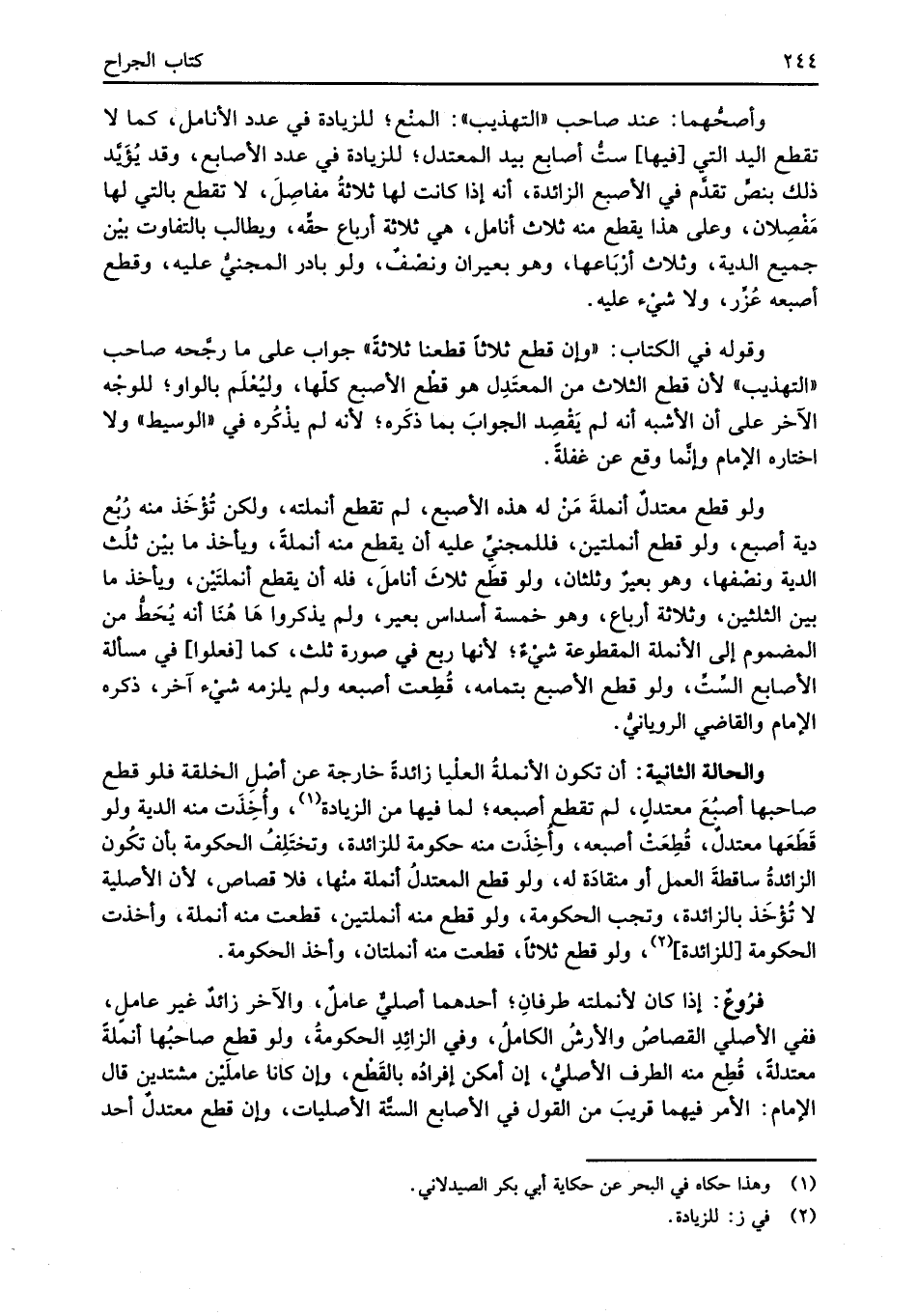 فرُوعٌ: إذا كان لأنملته طرفانِ؛ أحدهما أصليٌّ عاملٌ، والآخر زائدٌ غير عاملٍ، ففي الأصلي القصاصُ والأرشُ الكاملُ، وفي الزائِدِ الحكومةُ، ولو قطع صاحبُها أنملةً معتدلةً، قُطِع منه الطرف الأصليُّ، إن أمكن إفرادُه بالقَطْع، وإن كانا عاملَيْن مشتدين قال الإِمام: الأمر فيهما قريبَ من القول في الأصابع الستَّة الأصليات، كان قطع معتدلٌ أحد