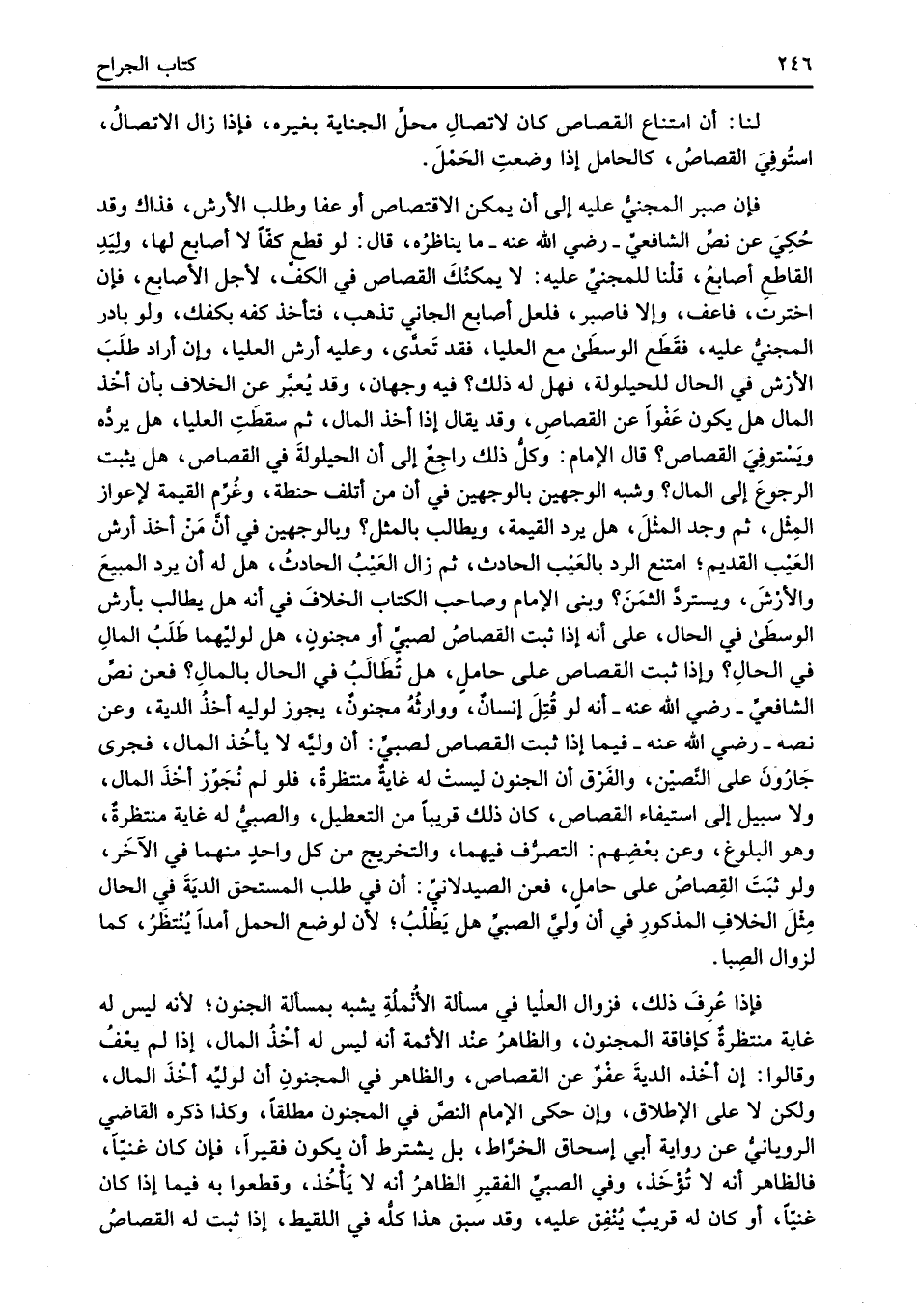 فإذا عُرِفَ ذلك، فزوال العلْيا في مسألة الأُنْملُةِ يشبه بمسألة الجنون؛ لأنه ليس له غاية منتظرةٌ كإفاقة المجنون، والظاهرُ عنْد الأئمة أنه ليس له أخْذُ المال، إذا لم يعْفُ وقالوا: إن أخْذه الديةَ عفْوٌ عن القصاص، والظاهر في المجنونِ أن لوليِّه أخْذَ المال، ولكن لا على الإطلاق، كان حكى الإِمام النصَّ في المجنون مطلقاً، وكذا ذكره القاضي الرويانيُّ عن رواية أبي إسحاق الخرَّاط، بل يشترط أن يكون فقيراً، فإن كان غنياً، فالظاهر أنه لا تُؤْخَذ، وفي الصبيِّ الفقيرِ الظاهرُ أنه لا يَأْخُذ، وقطعوا به فيما إذا كان غنيّاً، أو كان له قريبٌ يُنْفِق عليه، وقد سبق هذا كلُّه في اللقيط، إذا ثبت له القصاصُ