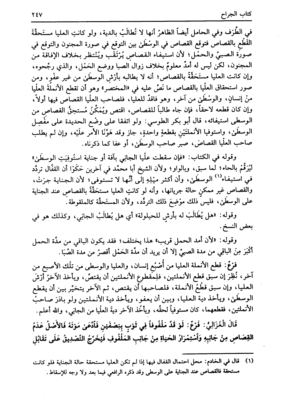 في الطَّرَف وفي الحامل أيضاً الظاهرُ أنها لا تُطالَبُ بالدية، ولو كانتِ العليا مستَحقَّةَ القَطْعِ بالقصاص فتوقع القصاص في الوسْطَى بين التوقع في صورة المجنون والتوقع في صورة الصبيِّ والحمْل؛ لأن استيفاء القصاصِ يُرْتَقَب ويُنْتظر بخلاف الإفاقة من المجنون، لكن ليس له أمدٌ معلومٌ بخلاف زوال الصبا ووضع الحَمْل، والذي رجَّحوه، وإن كانت العليا مستَحَقَّةً بالقصاص؛ أنه لا يطالبه بأرْشِ الوسطَى من غير عفْوٍ، ومن صور استحقاق العلْيا بالقصاص ما نَصَّ عليه في "المختصر" وهو أن تقطع الأنملةَ العلْيا منْ إنسانٍ، والوسْطَى من آخر، وهو فاقدٌ للعليا، فلصاحب العلْيا القصاص فيها أولاً، وإن كان قطعه لاحقاً، فإن جاء طالبا للقصاص، اقتص ويُمَكَّنُ مُستحِقُّ القصاصِ من الوسطى استيفائه، قال أبو بكر الطوسي: ولو اتفقا على وضْع الحديدة على مفْصِل الوسطَىئ، واستوفيا الأنملتَيْنِ بقطعةٍ واحدةٍ، جاز وقد هَوَّنَا الأمر علَيْه، وإن لم يطلب صاحب العلْيا القصاصَ، صبر صاحب الوسطَى، أو عفا كما ذكرناه.