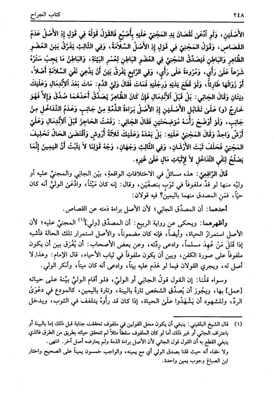 الأَصْلَيْنِ، وَلَوِ ادَّعَى نُقْصَانَ يَدِ المَجْنيِّ عَلَيْهِ بِأصْبُعٍ فَالقَوْلُ قَوْلُهُ فِي قَوْلٍ إذِ الأَصْلُ عَدَمُ القَصَاصِ، وَقَوْلُ المَجْنِيِّ فِي قَوْلٍ إذِ الأَصْلُ السَّلاَمَةُ، وَفِي الثَّالِثِ يُفَرَّقُ بَيْنَ العُضْوِ الظَّاهِرِ وَالبَاطِنِ فَيُصَدَّقُ المَجْنِيُّ فِي العُضْوِ البَاطِنِ لِعُسْرِ البَيِّنَةِ، وَالبَاطِنُ مَا يَجِبُ سَتْرُهُ شَرْعَاً عَلَى رَأْيِ، وَمُرُوءَةً عَلَى رَأْيٍ، وَفِي الرَّابعِ يُفْرَقُ بَيْنَ أَنْ يَدَّعِيَ نَفْيَ السَّلاَمَةِ أَصْلاً، أَوْ زَوَالَهَا طَارِئاً، وَلَوْ قَطَعَ يَدَيْهِ وَرِجْلَيْهِ فَمَاتَ فَقالَ وَلِيُّ الدَّمِ: مَاتَ بَعْدَ الاِنْدِمَالِ وَعَلَيْكَ دِيَتَانِ وَقَالَ الجَانِي: بَلْ قَبْلَ الانْدِمَالِ فَإنْ كَانَ الظَّاهِرُ يُصَدَّقُ أَحَدُهُمَا صُدِّقَ وَإِلاَّ فَهُوَ خَارجٌ (و) عَلَى تَقَابُلِ الأَصْلَيْنِ إذِ الأَصْلُ بَرَاءَةُ الذِّمَّةِ مِنْ جَانِبٍ وَعَدَمُ التَّدَاخُلِ مِنْ جَانِبٍ، وَلَوْ أَوْضَحَ رَأْسَهُ مُوْضِحَتَيْن فَقَالَ الجَانِي: رَفَعْتُ الحَاجِزَ قَبْلَ الانْدِمَالِ وَعَلَيَّ أَرْشٌ وَاحِدٌ وَقَالَ المَجْنِيُّ عَلَيْهِ: بَلْ بَعْدَهُ وَعَلَيْكَ ثَلاَثة أُرُوشٍ وَاقْتَضَى الحَالُ تَحْلِيفَ المَجْنِيِّ فَحَلَفَ ثَبَتَ الأَرْشَانِ، وَفِي الثَّالِثِ وَجْهَانِ، وَجْة قَوْلِنَا لاَ يَثْبُتُ أَنَّ اليَمِينَ إنَّمَا يَصْلُحُ لِنَفْيِ التَّدَاخُلِ لاَ لإِثْبَاتِ مَالٍ عَلَى غَيْرِهِ.