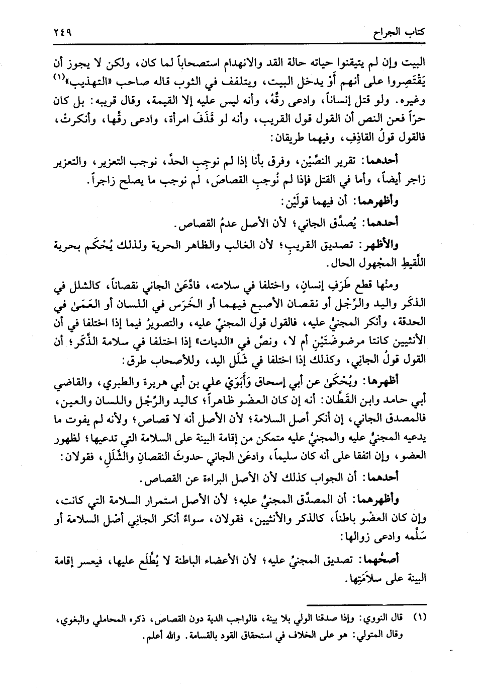 أظهرها: ويُحْكَى عن أبي إسحاق وَأَبَوَيْ علي بن أبي هريرة والطبري، والقاضي أبي حامد وابن القَطَّان: أنه إن كان العضْو ظاهراً؛ كاليد والرِّجْل واللسان والعين، فالمصدق الجاني، إن أنكر أصل السلامة؛ لأن الأصل أنه لا قصاص؛ ولأنه لم يفوت ما يدعيه المجنيُّ عليه والمجنيُّ عليه متمكن من إقامة البينة على السلامة التي تدعيها؛ لظهور العضو، وإن اتفقا على أنه كان سليماً، وادعَى الجاني حدوثَ النقصانِ والشَّلَلِ، فقولان: