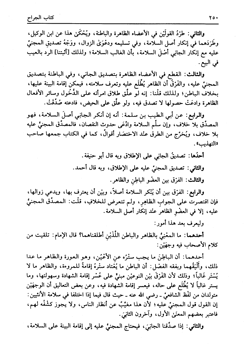 والرابع: الفرْق بين أن يُنْكر السلامة أصلاً، وبيْن أن يعترف بها، ويدعي زوالها، فإن اقتصرت على الجوابِ الظاهِرِ، ولم تتعرض للخلافِ، قلْت: المصدَّق المجنيُّ عليه، إلا في العضْوِ الظاهر عند إنكار أصل السلامة.