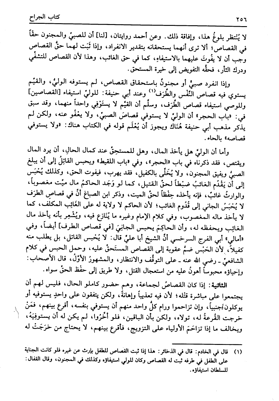 لا يُنْتظر بلوغُ هذا، وإفاقة ذلك. وعن أحمد روايتان، [لنا] أن للصبيِّ والمجنون حقّاً في القصاص؛ ألا ترى أنهما يستحقانه بتقدير الانفراد، وإذا ثَبَت لهما حقُّ القصاص وجب أن لا يفُوتَ عليهما بالاستيفاءِ، كما في حق الغائب، وهذا لأن القصاص للتشفِّي ودرك الثأر، فحقُّه التفويض إلى خيرة المستحق.