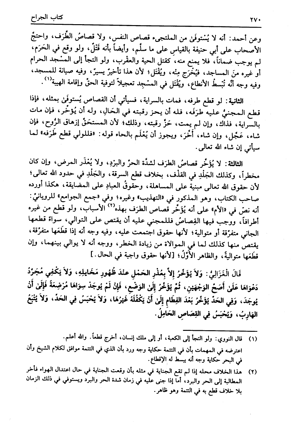 وعن أحمد: أنه لا يُسْتوفَى من الملتجئ قصاص النفس، ولا قصاصُ الطَّرَف، واحتجَّ الأصحاب على أبي حنيفة بالقياسِ على ما سلَّم، وأيضاً بأنه قَتْلٌ، ولو وقع في الحَرَم، لم يوجب ضماناً، فلا يمنع منه، كقتل الحية والعقْرب، ولو التجأ إلى المسْجد الحرام أو غيره منَ المساجد، فيُخْرَج مِنْه، ويُقْتَل؛ لأن هذا تأخيرٌ يسيرٌ، وفيه صيانة للمسجد، وفيه وجه أنَّه تُبْسطُ الأنطاع، ويُقْتَل في المسْجِد تعجيلاً لتوفية الحقِّ وإقامة الهيبة (¬1).