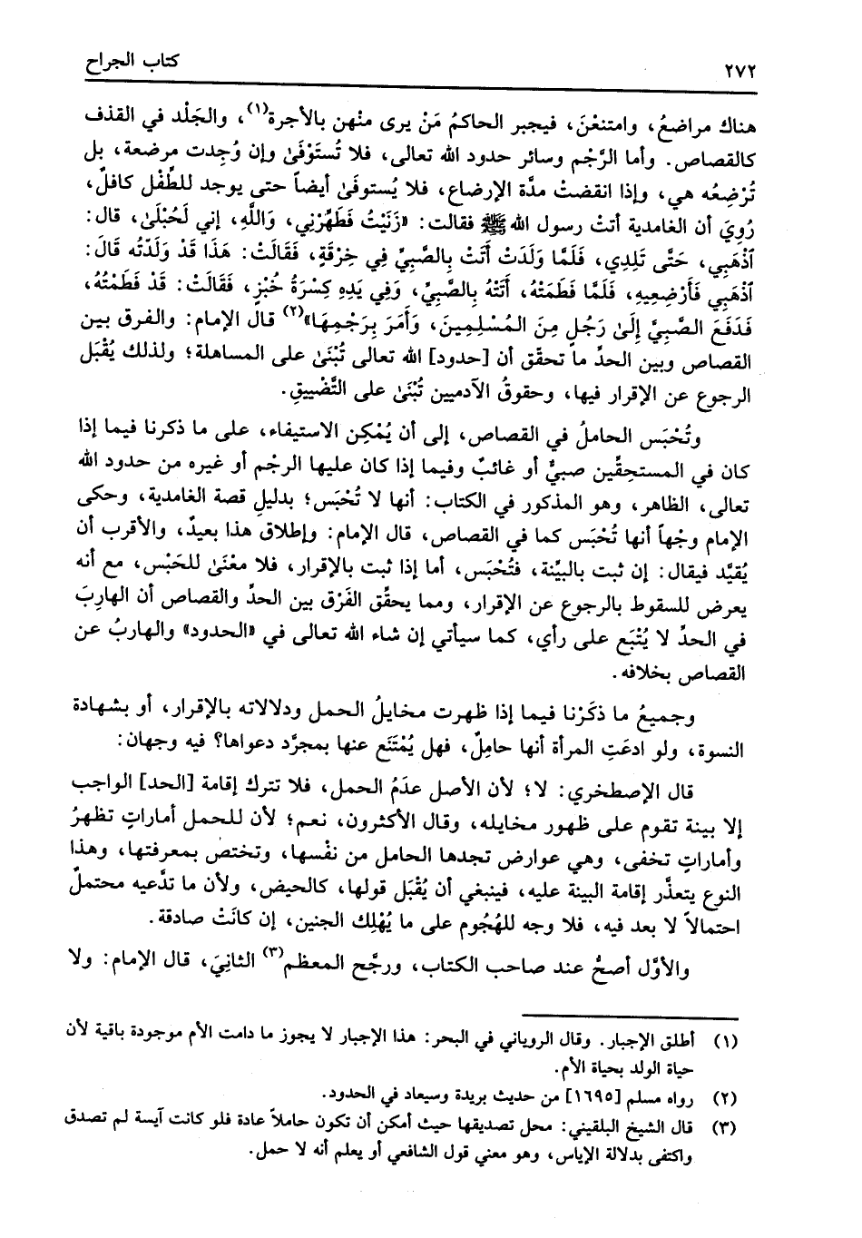 وتُحْبَس الحاملُ في القصاص، إلى أن يُمْكِن الاستيفاء، على ما ذكرنا فيما إذا كان في المستحِقِّين صبيٌّ أو غائبٌ وفيما إذا كان عليها الرجْم أو غيره من حدود الله تعالى، الظاهر، وهو المذكور في الكتاب: أنها لا تُحْبَس؛ بدليلِ قصة الغامدية، وحكى الإِمام وجْهاً أنها تُحْبَس كما في القصاص، قال الإِمام: وإطلاق هذا بعيدٌ، والأقرب أن يُقيَّد فيقال: إن ثبت بالبيِّنة، فتحْبَس، أما إذا ثبت بالإقرار، فلا معْنَى للحَبْس، مع أنه يعرض للسقوط بالرجوع عن الإقرار، ومما يحقِّق الفَرْق بين الحدِّ والقصاص أن الهارِبَ في الحدِّ لا يُتْبَع على رأي، كما سيأتي إن شاء الله تعالى في "الحدود" والهاربُ عن القصاص بخلافه.