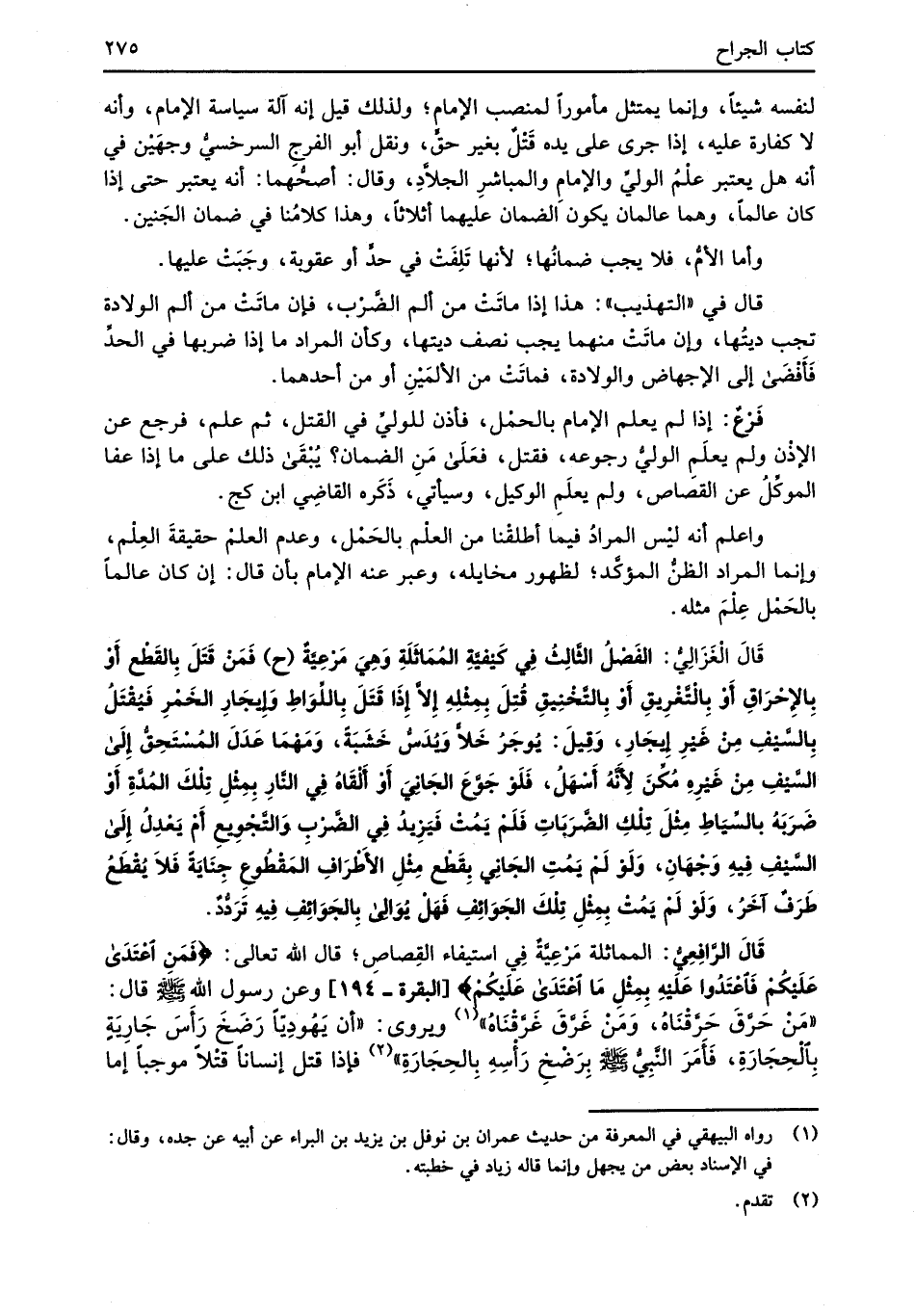قَالَ الْغَزَالِيُّ: الفَصْلُ الثَّالِث فِي كيْفيَّةِ المُمَاَثَلَةِ وَهِيَ مَرْعيَّةٌ (ح) فَمَنْ قَتَلَ بِالقَطْع أَوْ بِالإحْرَاقِ أَوْ بِالْتَّغْرِيقِ أَوْ بِالتَّخْنِيقِ قُتِلَ بِمِثْلِهِ إلاَّ إِذَا قَتَلَ باللِّوَاطِ وَإيجَارِ الخَمْرِ فَيُقْتَلُ بِالسَّيْفِ مِنْ غَيْرِ إِيْجَارِ، وَقِيلَ: يُوجَرُ خَلاًّ وَيُدَسُّ خَشَبَةً، وَمَهْمَا عَدَلَ المُسْتَحِقُّ إِلَى السَّيْفِ مِنْ غَيْرِهِ مُكِّنَ لأَنَّهُ أَسْهَلُ، فَلَوْ جَوَّعَ الجَانِيَ أَوْ أَلْقَاهُ فِي النَّارِ بِمِثْلِ تِلْكَ المُدَّةِ أَوْ ضَرَبَهُ بالسِّيَاطِ مِثْلَ تِلْكِ الضَّربَاتِ فَلَم يَمُتْ فَيَزِيدُ فِي الضَّرْبِ وَالتَّجْوِيعِ أَمْ يَعْدِلُ إِلَى السَّيْفِ فِيهِ وَجْهَانِ، وَلَو لَمْ يَمُتِ الجَانِي بِقَطْع مِثْلِ الأَطْرَافِ المَقْطُوعِ جِنَايَةً فَلاَ يُقْطَعُ طَرَفٌ آخَرُ، وَلَوْ لَمْ يَمُتْ بِمِثْلِ تِلْكَ الجَوَاِئفِ فَهَلْ يُوَالِى بِالجَوَاِئفِ فِيهِ تَرَدُّدٌ.