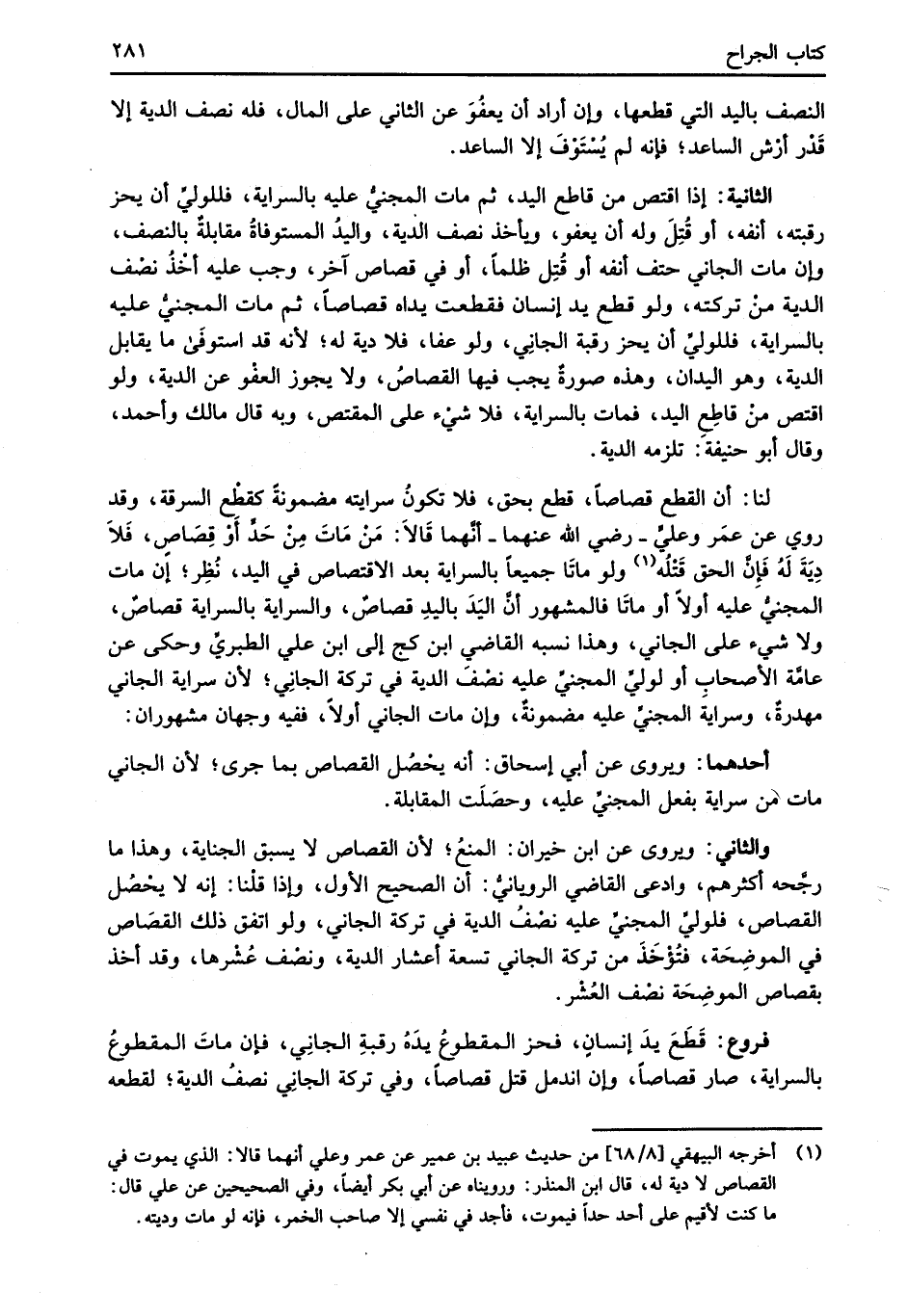 الثانية: إذا اقتص من قاطع اليد، ثم مات المجنيُّ عليه بالسراية، فللوليِّ أن يحز رقبته، أنفه، أو قُتِلَ وله أن يعفو، ويأخذ نصف الدية، واليدُ المستوفاةُ مقابلةٌ بالنصف، وإن مات الجاني حتف أنفه أو قُتِل ظلماً، أو في قصاص آخر، وجب عليه أخْذُ نصْف الدية منْ تركته، ولو قطع يد إنسان فقطعت يداه قصاصاً، ثم مات المجنيُّ عليه بالسراية، فللوليِّ أن يحز رقبة الجانِي، ولو عفا، فلا دية له؛ لأنه قد استوفَى ما يقابل الدية، وهو اليدان، وهذه صورةٌ يجب فيها القصاصُ، ولا يجوز العفْو عن الدية، ولو اقتص منْ قاطِعٍ اليد، فمات بالسراية، فلا شيْء على المقتص، وبه قال مالك وأحمد، وقال أبو حنيفة: تلزمه الدية.