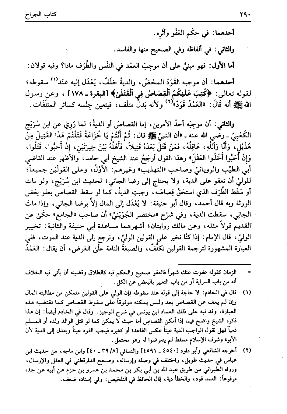 (¬2) أخرجه الشَّافعي وأبو داود [4540 - 4591] والنسائي [8/ 39 - 40] وابن ماجه، من حديث ابن عباس في حديث طويل، واختلف في وصله وإرساله، وصحح الدارقطني في العلل والإرسال، ورواه الطبراني من طريق عبد الله بن أبي بكر بن محمد بن عمرو بن حزم عن أبيه عن جده مرفوعاً: العمد قود، والخطأ دية، قال الحافظ في التلخيص: وفي إسناده ضعف.