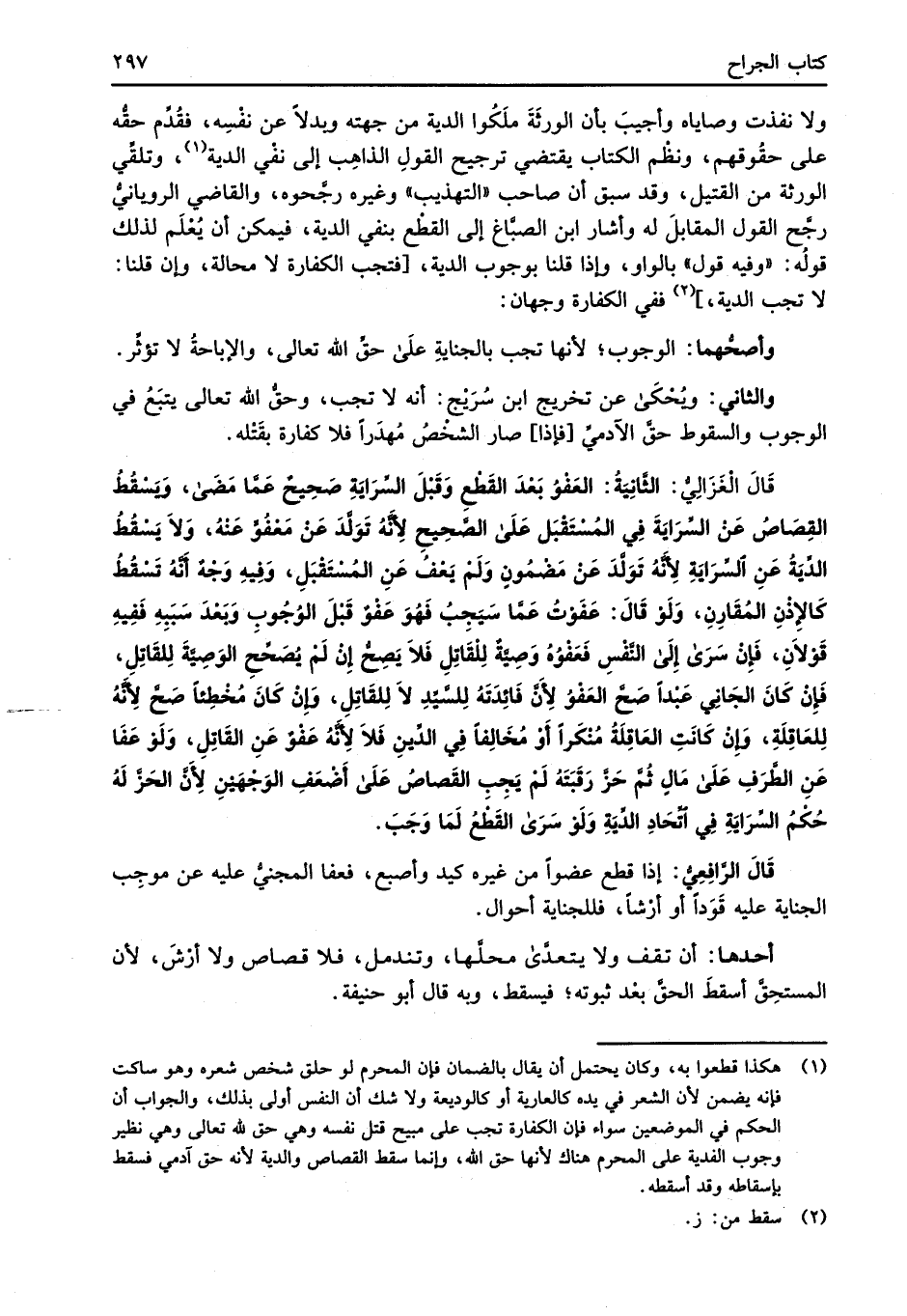 ولا نفذت وصاياه وأجيبَ بأن الورثَةَ ملَكُوا الدية من جهته وبدلاً عن نفْسِه، فقُدِّم حقُّه على حقُوقهم، ونظم الكتاب يقتضي ترجيح القولِ الذاهِب إلى نفْي الدية (¬1)، وتلقِّي الورثة من القتيل، وقد سبق أن صاحب "التهذيب" وغيره رجَّحوه، والقاضي الرويانيُّ رجَّح القول المقابلَ له وأشار ابن الصبَّاغ إلى القطْع بنفي الدية، فيمكن أن يُعْلَم لذلك قوله: "وفيه قول" بالواو، وإذا قلنا بوجوب الدية، [فتجب الكفَّارة لا محالة، وإن قلنا: لا تجب الدية،] (¬2) ففي الكفَّارة وجهان: