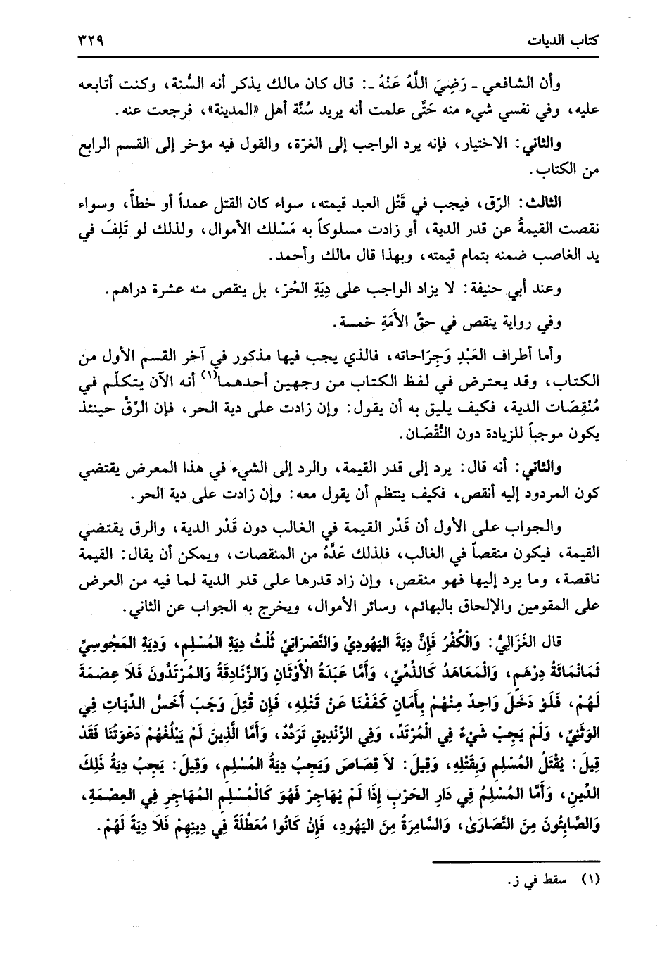 قال الغَزَالِيُّ: وَالْكُفْرُ فَإِنَّ دِيَةَ اليَهُودِيِّ وَالنَّصْرَانِيِّ ثُلْثُ دِيَةِ المُسْلِمِ، وَدِيَةِ المَجُوسِيِّ ثَمَانْمَائَةُ دِرْهَمٍ، وَالْمَعَاهَدُ كَالذِّمِّيِّ، وَأَمَّا عَبَدَةُ الأَوْثَانِ وَالزَّنَادِقَةُ وَالمُرْتَدُّونَ فَلاَ عِصْمَةَ لَهُمْ، فَلَوْ دَخَلَ وَاحِدٌ مِنْهُمْ بِأَمَانٍ كَفَفْنَا عَنْ قَتْلِهِ، فَإِنْ قُتِلَ وَجَبَ أَخَسُّ الدِّيَاتِ في الوَثَنيِّ، وَلَمْ يَجِبْ شَيءٌ في الْمُرْتَدِّ، وَفِي الزِّنْدِيقِ تَرَدُّدٌ، وَأَمَّا الَّذِينَ لَمْ يَبلُغهُمْ دَعْوَتُنَا فَقَدْ قِيلَ: يُقْتَلُ المُسْلِمِ وَبِقَتْلِهِ، وَقِيلَ: لاَ قِصَاصَ وَيجِبُ دِيَةُ المُسْلِمِ، وَقِيلَ: يَجِبُ دِيَةُ ذَلِكَ الدِّينِ، وَأَمَّا المُسْلِمُ فِي دَارِ الحَرْبِ إِذَا لَمْ يُهَاجِرْ فَهُوَ كَالمُسْلِمِ المُهَاجِرِ فِي العِصْمَةِ، وَالصَّابِئونَ مِنَ النَّصَارَى، وَالسَّامِرَةُ مِنَ اليَهُودِ، فَإِنْ كَانُوا مُعَطَّلَةَ في دِينِهِمْ فَلاَ دِيَةً لَهُم.