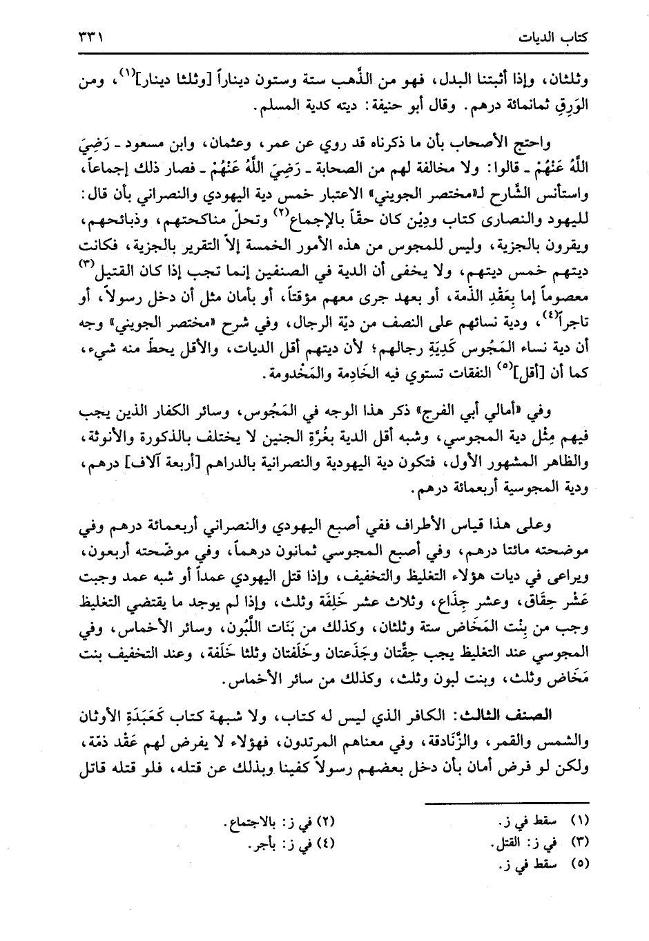 وعلى هذا قياس الأطراف ففي أصبع اليهودي والنصراني أربعمائة درهم وفي موضحته مائتا درهم، وفي أصبع المجوسي ثمانون درهماً، وفي موضّحته أربعون، ويراعى في ديات هؤلاء التغليظ والتخفيف، وإذا قتل اليهودي عمداً أو شبه عمد وجبت عَشْر حِقَاق، وعشر جِذَاع، وثلاث عشر خَلِفَة وثلث، وإذا لم يوجد ما يقتضي التغليظ وجب من بِنْت المَخَاض ستة وثلثان، وكذلك من بَنَات اللَّبُون، وسائر الأخماس، وفي المجوسي عند التغليظ يجب حِقَّتان وجَذَعتان وخَلَفتان وثلثا خَلَفة، وعند التخفيف بنت مَخَاض وثلث، وبنت لبون وثلث، وكذلك من سائر الأخماس.