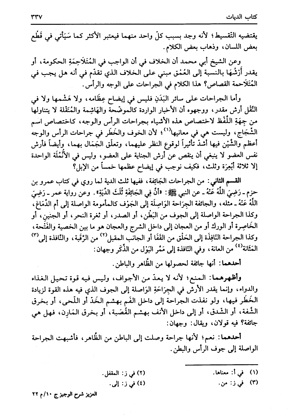 القسم الثاني: من الجراحات الجَائِفة، ففيها ثلث الدية لما روي في كتاب عمرو بن حزم -رَضِيَ اللهُ عَنْهُ- عن النبي -صلى الله عليه وسلم-: " أنَّ فِي الجَائِفَةِ ثُلَثَ الدِّيَةِ". وعن رواية عمر -رَضِيَ اللهُ عَنْهُ- مثله، والجائفة الجِرَاحة الوَاصِلَة إلى الجَوْف كالمأمومة الواصلة إلى أم الدِّمَاغ، وكذا الجراحة الواصلة إلى الجوف من البَطْن، أو الصدر، أو ثغرة النحر، أو الجنينِ، أو الخَاصِرة أو الورك أو من العجان إلى داخل الشرج والعجان هو ما بين الخصية والفَتْحة، وكذا الجراحة النَافِذَة إلى الحَلق من القَفَا أو الجانب المقبل (¬2) من الرَّقَبة، والنَّافذة إلى (¬3) المَثَانة (¬4) من العانة، وفي النّافذة إلى مَمَّر البَوْل من الذَّكَر وجهان: