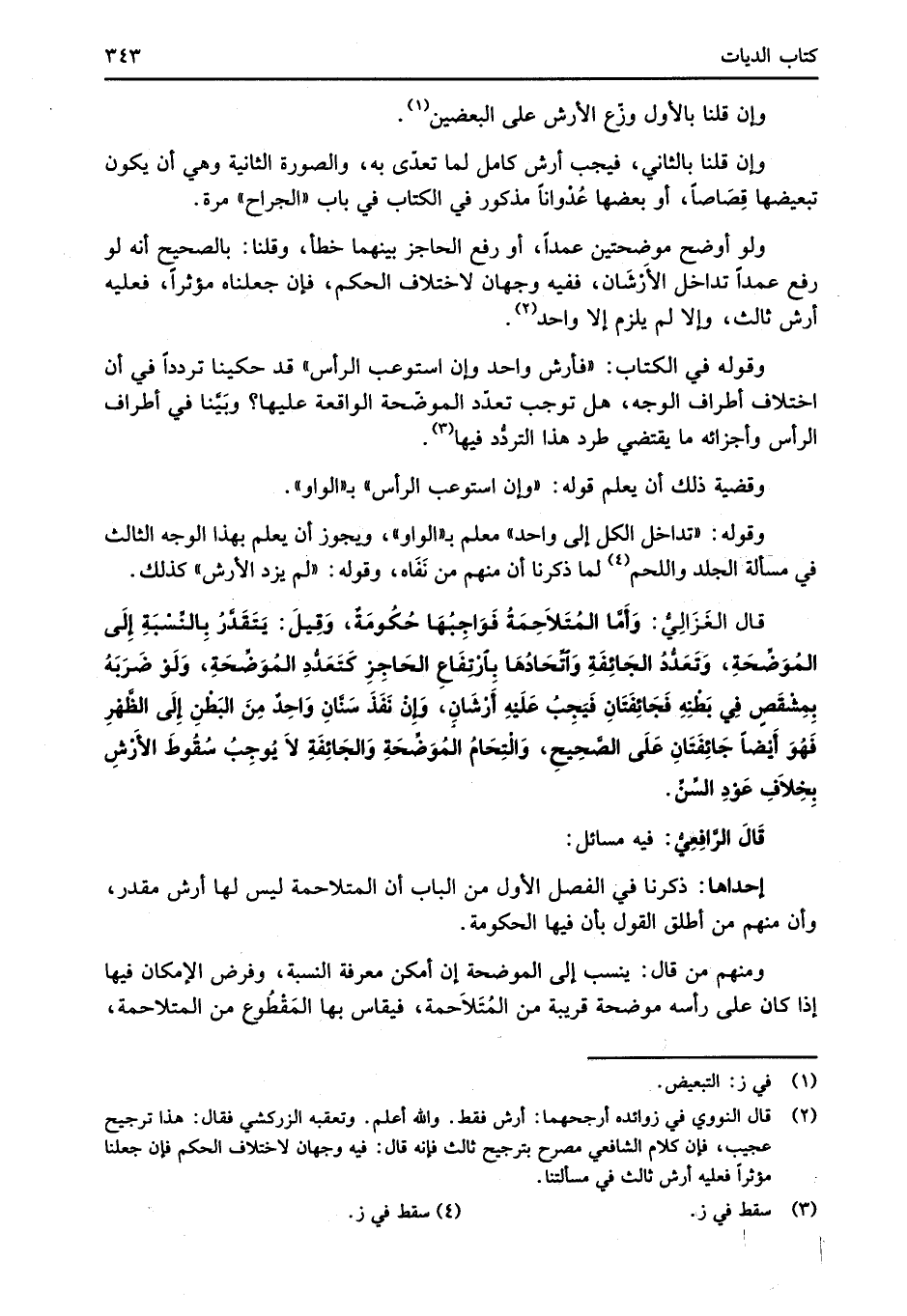 وقوله: "تداخل الكل إلى واحدة" معلم بـ"الواو"، ويجوز أن يعلم بهذا الوجه الثالث في مسألة الجلد واللحم (¬4) لما ذكرنا أن منهم من نَفَاه، وقوله: "لم يزد الأرش" كذلك.