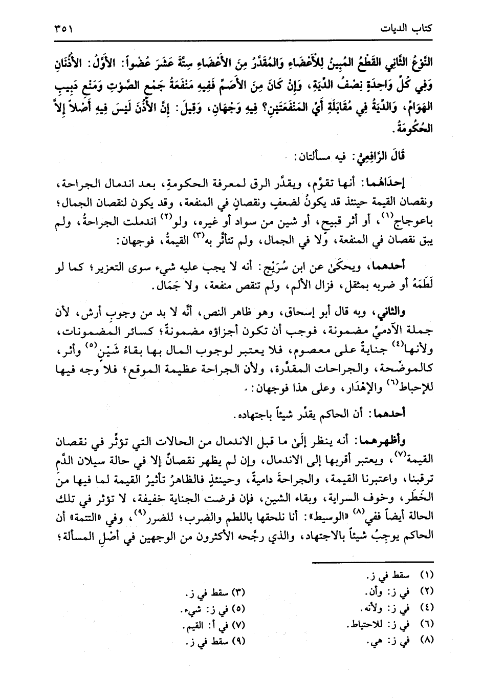 النَّوْعُ الثَّانِي القَطْعُ المُبِينُ لِلأَعْضَاءِ وَالمُقَدَّرُ مِنَ الأَعْضَاءِ سِتَّةَ عَشَرَ عُضْواً: الأَوَّلُ: الأُذُنَانِ وَفِي كُلِّ وَاحِدَةٍ نِصْفُ الدِّيَةِ، وَإِنَ كَانَ مِنَ الأَصَمِّ فَفِيهِ مَنْفَعَةُ جَمْع الصَّوْتِ وَمَنْعِ دَبِيبِ الهَوَامِّ، وَالدِّيَةُ فِي مُقَابَلَةِ أَيِّ المَنْفَعَتَيْنِ؟ فِيهِ وَجْهَانِ، وَقِيلَ: إنَّ الأذُنَ لَيْسَ فِيهِ أَصْلاً إلاَّ الحُكُومَةُ.